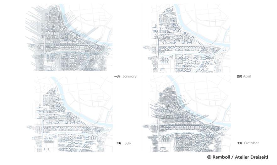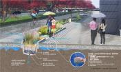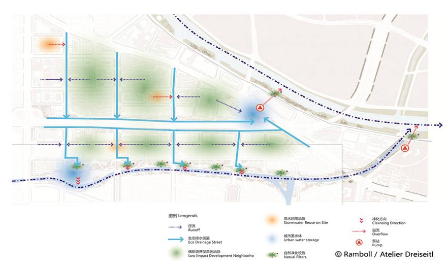 天津新八里的生態(tài)水系統(tǒng)從單一排放模式向分散式綜合管理轉(zhuǎn)變,排水體系由管渠模式向綜合低影響開發(fā)模式轉(zhuǎn)變。生態(tài)水管理按照“低影響開發(fā)”及水循環(huán)利用等設(shè)計原則展開實施設(shè)計,即通過有效的水文設(shè)計,綜合采用入滲、過濾、蒸發(fā)和蓄流等方式減少徑流排水量,使城市開發(fā)區(qū)域的水文功能盡量接近開發(fā)之前的狀況。最大化的保證未來場地開發(fā)的生態(tài)效益,對區(qū)域內(nèi)的生態(tài)水源進(jìn)行利用,同時最大化降低洪澇災(zāi)害的危險。各開發(fā)微單元用地根據(jù)透水性的差別分為6類下墊面,其中綠地、透水路面、綠色屋頂為可透水面積,根據(jù)不同下墊面平均徑流系數(shù)的不同,進(jìn)行計算,科學(xué)地管理各分散地塊的地表徑流,評估洪澇災(zāi)害發(fā)生的可能。暴雨削峰/滯留計算結(jié)果顯示,結(jié)合約17573立方的滯留容積,可將三年一遇標(biāo)準(zhǔn)的市政管網(wǎng)排放能力提升至10年重現(xiàn)期雨水排放標(biāo)準(zhǔn)。同時,生態(tài)道路排水帶的設(shè)計,改變了傳統(tǒng)道路斷面結(jié)構(gòu),將綠化隔離帶和雨水花園結(jié)合構(gòu)成車道表面排水,使之作為一個“獨(dú)立”的土壤過濾系統(tǒng)與道路景觀融為一體。