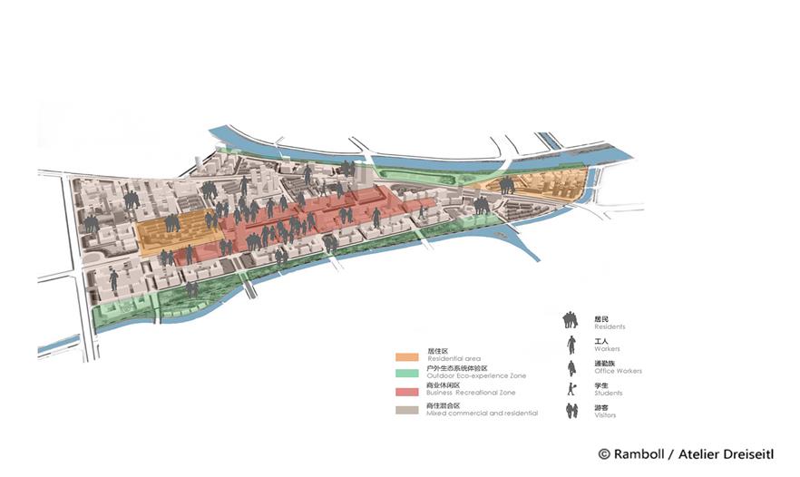 如今的海河及復(fù)興運(yùn)河已經(jīng)失去了以往的航運(yùn)功能,它們曾經(jīng)作為旅游、海上貿(mào)易、漁業(yè)的交通軸線,并發(fā)揮軍事防御功能。今天,它們已經(jīng)成為城市之中人們得以放松身心、回歸自然的最佳選擇之地?,F(xiàn)存的運(yùn)河就像景觀平面上開鑿的關(guān)聯(lián)線條。復(fù)興河濱公園也將與之前的水道結(jié)合,成為天津城市內(nèi)部綠帶系統(tǒng)中的一部分,河濱公共公園將成為天津八里城區(qū)的前花園。公園用地面積約為17.7公頃,直線長度1.8km,最寬處211m,最窄處55m。復(fù)興河以大的動線道路廣場系統(tǒng)為主軸。 采用一動線(最寬處27m,最窄處3m),一系統(tǒng)(雨水生態(tài)凈化系統(tǒng))兩步道(濱水步道與鐵路步道的),四平臺廣場的總體結(jié)構(gòu)。 把整個復(fù)興河公園各個區(qū)塊的循環(huán)系統(tǒng)串聯(lián)為一個整體的城市綠肺帶。它的設(shè)計靈感來源于傳統(tǒng)的音樂創(chuàng)作形式—賦格。賦格是一種運(yùn)用兩種或更多的聲部重復(fù)對位的演奏形式,自初始部分即建立并進(jìn)入主旋律,通過模仿以及不同位置的重復(fù),在貫穿整個樂曲的過程之中進(jìn)行反復(fù)的演繹。復(fù)興河濱公園的設(shè)計主線來源于天津自然景觀之中的天然水生植物。主干園路串聯(lián)起公園各空間組成基調(diào)。之前存在的成唐莊鐵路遺跡改造道路及次級流線行步行道凸顯出公園的連貫性,一條蜿蜒的絲帶狀園路連接了城市邊緣和水岸區(qū)域,它輕柔的撫過園中鐵路線路并最終與外部城市綠環(huán)連接。如交響樂章般,復(fù)興河公園的四個部分使得城市的組團(tuán)(里)擁有了各自中心部位對應(yīng)的主要公園廣場。公園內(nèi)部開放綠色空間的韻律與城市空間結(jié)構(gòu)的韻律相呼應(yīng),跨越復(fù)興河的橋梁在連接城市兩岸的同時也成為在穿越這四個流動旋律間的經(jīng)典停頓。
