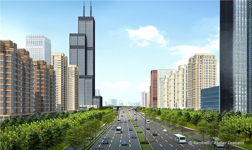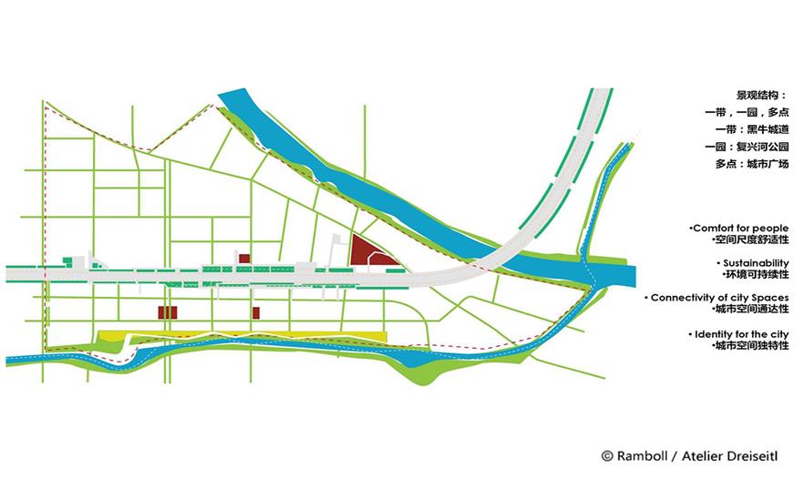 公共空間景觀規(guī)劃結(jié)構(gòu)可概況為“一帶,一園,多點(diǎn)”。黑牛城道兩側(cè)區(qū)域大部分用地現(xiàn)為工業(yè)用地,廠區(qū)中有風(fēng)格各異的廠房,運(yùn)輸貨物的鐵軌、以及很多機(jī)械設(shè)備及氣電管道。隨著城市的開發(fā)建設(shè),他們或被拆除、或被保留改造,將成為見證這里工業(yè)歷史及文化的標(biāo)識。黑牛城路作為城市主體交通系統(tǒng)的組成部分,同時也具備成為城市地區(qū)新的發(fā)展樞紐的潛力。它的存在位置能夠?qū)⒅饕淖匀辉兀ǔ膳诺臉淠荆┮氤鞘兄行模瑥亩黾映菂^(qū)心臟區(qū)域的綠量。高速公路沿線為高大的成排樹木(梧桐樹)的種植提供栽植空間。而在黑牛城中心區(qū)域兩側(cè),樹木的排列會更加簡明,為人們的戶外活動舒適性提供保障。