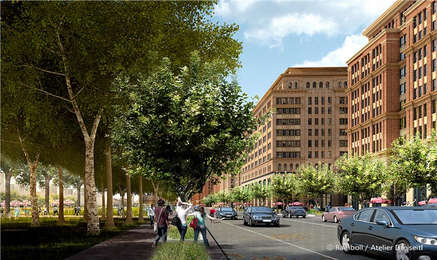 街道作為人體尺度的城市網(wǎng)格,設(shè)計意圖即為優(yōu)化行人所在的開放空間品質(zhì)并實現(xiàn)水敏城市設(shè)計愿景。通過高密度的樹木栽種提供了遮陽、擋風(fēng)的場所,同時也有利于收集和凈化地表雨水徑流。材料、顏色和圖案鋪設(shè)形式遵循已建成的天津文化中心以及輻射至周邊區(qū)域規(guī)劃之中運(yùn)用的設(shè)計原則。借鑒歐洲城市特有的道路風(fēng)格,綜合天津的地源文化,提煉出屬于天津城市特色街道樣式。在道路系統(tǒng)鋪裝設(shè)計中,在材料及顏色上注重當(dāng)?shù)亟ㄖL(fēng)格元素的提取。在色彩定位方面主要為兩類:其中暖黃色,赭石灰色,紅色,常見于當(dāng)?shù)氐膫鹘y(tǒng)建筑顏色;中灰色,冷灰色常見于現(xiàn)代建筑。