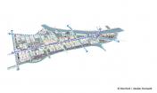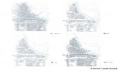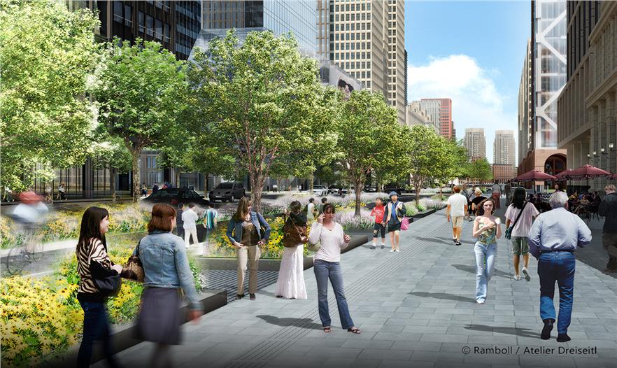 多點(diǎn)即指多個城市廣場。城市廣場是城市結(jié)構(gòu)之中的個體,擁有不同的場地面積、位于不同的位置,它們在城市中心內(nèi)部組織開放空間系統(tǒng),為人們戶外放松提供場地,同時定義場所地址、有助于組織城市網(wǎng)絡(luò)結(jié)構(gòu)。它們并不僅僅通過相鄰建筑物所賦予的功能獨(dú)立存在,同時它們定義了地面的水平線。在擁有變幻高度的毗鄰宏偉建筑物的城市結(jié)構(gòu)之中,每一處廣場都擁有其自身的場地邏輯性設(shè)計。通過平面框架(人行邊道)與三維空間形式結(jié)合的形式,每個廣場擁有獨(dú)特的設(shè)計原則,其高度控制由特定的水元素決定: