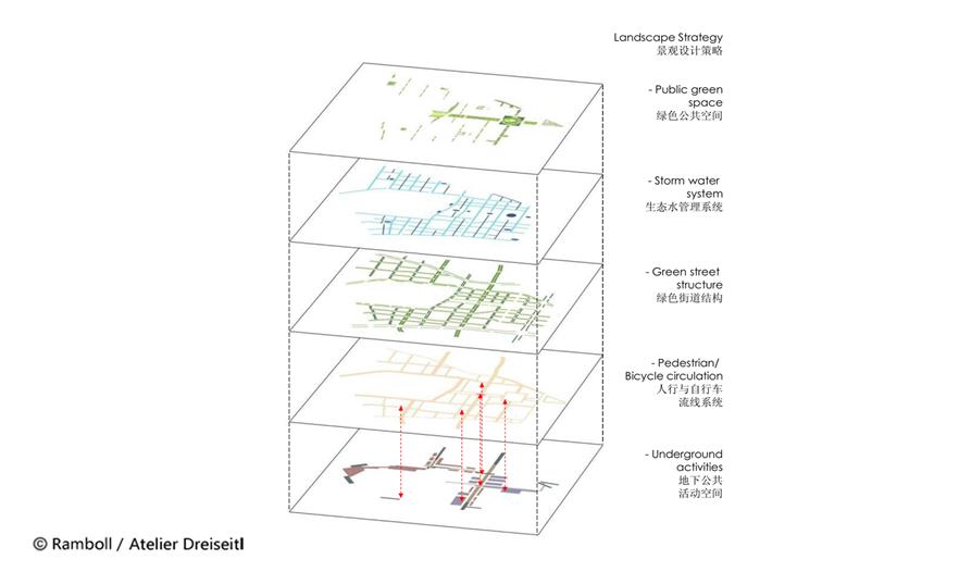 天津河西中央商務(wù)區(qū)景觀規(guī)劃設(shè)計(jì)的目標(biāo)是以SOM建筑設(shè)計(jì)事務(wù)所的綜合規(guī)劃方案為基礎(chǔ),在區(qū)域內(nèi)創(chuàng)建相互交疊的城市自然、文化、社交體系;綠色開(kāi)放空間網(wǎng)絡(luò)、藍(lán)色空間和水系網(wǎng)絡(luò);綠色基礎(chǔ)設(shè)施與交通整合體系;步行為主、具備高度實(shí)用性的活力城市空間網(wǎng)絡(luò);以及地下公共活動(dòng)空間連接體系等城市愿景。這些網(wǎng)絡(luò)層次在城市中相互疊加,將天津文化中心二期即天津河西中央商務(wù)區(qū)規(guī)劃成為國(guó)際化、可持續(xù)、豐富多彩、充滿活力的城市網(wǎng)絡(luò)空間。