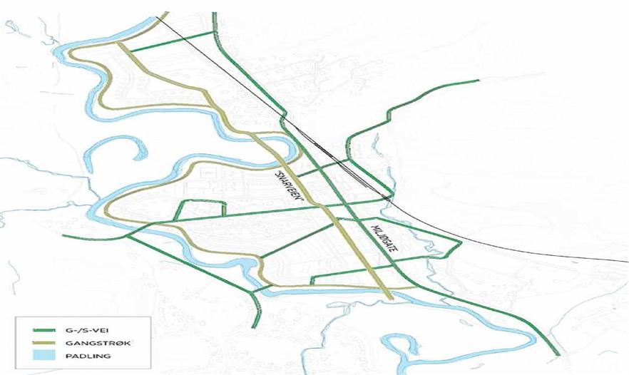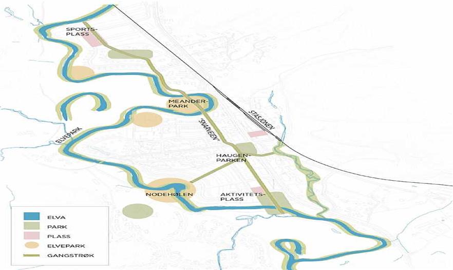 Nodelands城市中心內外都增強了密度,火車站或車站廣場和Hauge公園就位于中心區(qū)域。商業(yè)空間都集中在中心,設有商店、舉辦活動、參與體育運動和引人注目的聚會區(qū)。新的蜿蜒型住宅社區(qū)循著河流蜿蜒發(fā)展,構成一個特色的曲折布局。主街沿線的步行道都是擴寬的,而且人行道和自行車道路網會激發(fā)人們的生活樂趣。新的道路——Shortcut通過城市中心開放的庭院營造出一個綠色、安全的連接線,而且河流沿線的新林蔭大道可以免費使用城市劃艇。濱河林蔭道和Shortcut道路將Nodeland所有的廣場、公園和公共空間連接起來。