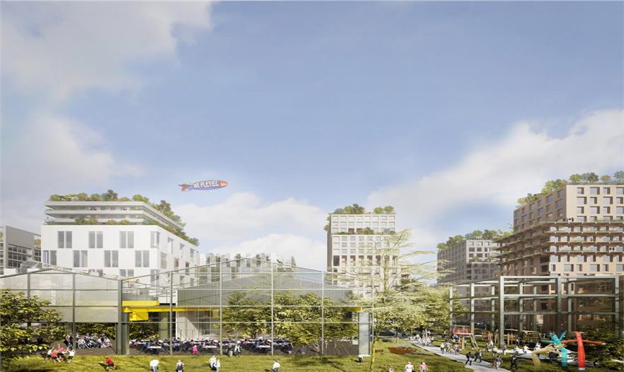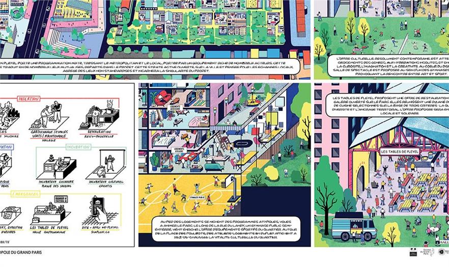在十位建筑師所提供的建筑理念之上,綠色景觀被認(rèn)為是第十一項最重要的“建筑”。離社區(qū)越近,越需要植物。我們所提出的綠色空間不管是對現(xiàn)有環(huán)境,還是對未來發(fā)展都有好處。Rue Pleyel 轉(zhuǎn)型為一種Rambla(巴塞羅那-蘭布拉大街,被譽(yù)為歐洲最美的林蔭大道)為整個社區(qū)的戶外活動提供了去處。綠地以林蔭道的形式進(jìn)入場地,以“places paysages(建筑包圍的戶外活動場地)”的形式達(dá)到高潮,旨在營造出城市和公園的和諧整體。