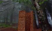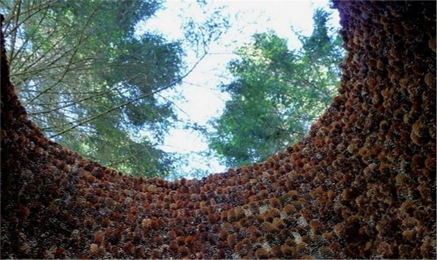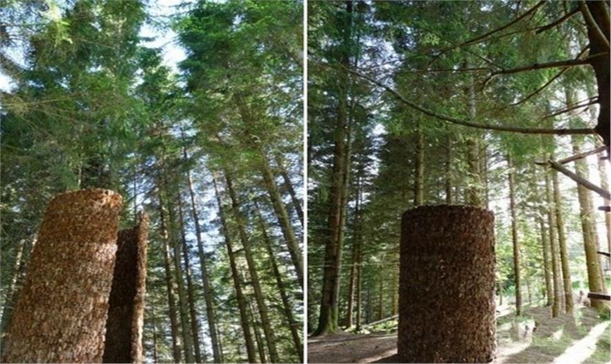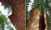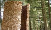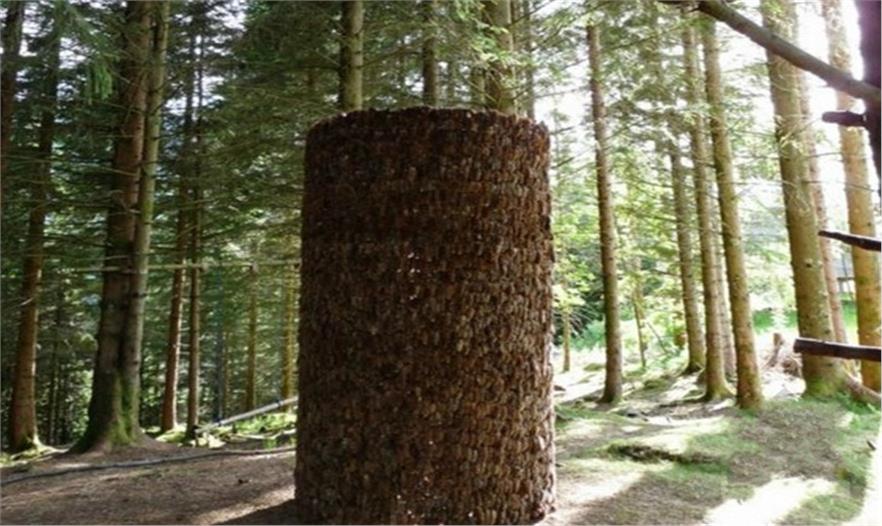 設(shè)計(jì)師從自然界汲取靈感,搭建這個(gè)涼亭的材料大部分是設(shè)計(jì)師從森林里收集的松果。設(shè)計(jì)師將成千上萬(wàn)的松果巧妙精細(xì)地層疊搭建成半封閉式的圓柱狀涼亭,將參觀者包圍在其中,讓其更好地觀察和感受森林氣息。涼亭里向上可以欣賞森林里的天空。