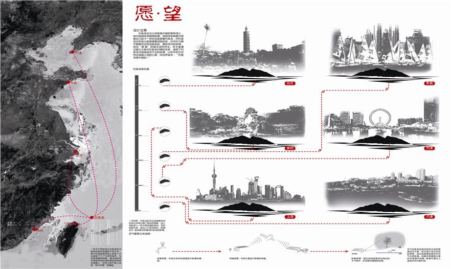 釣魚島競賽—“愿.望”:將大陸與釣魚島的關(guān)系擬化成母親與孩子的關(guān)系,一水相望、血脈相連成為該方案的主設(shè)計(jì)線。參賽者在收集了詳細(xì)的島嶼資料后,有針對性的選擇了5個城市做相互投影。對日常生活觀察入微,很好的利用了海島的自然地理環(huán)境,創(chuàng)新性的拓展了海島的物理聯(lián)系方式。