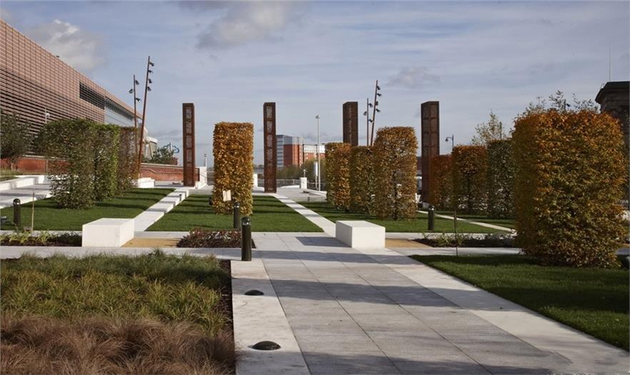 東邊城市公園坐落于一個長800米的棕地上,向東一直延伸到公園路(Park Street),并沿著Grimshaw設(shè)計的Millennium Point設(shè)計。其公共娛樂空間有3.4公頃,還有188米長的運河和21座噴泉。