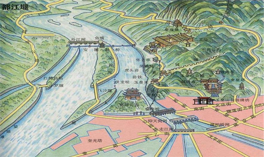 都江堰坐落在成都平原西部的岷江上,位于四川省都江堰市城西。都江堰不僅是舉世聞名的中國古代水利工程,也是著名的風(fēng)景名勝區(qū)。都江堰附近景色秀麗,文物古跡眾多,主要有伏龍觀、二王廟、安瀾索橋、玉壘關(guān)、離堆公園、玉壘山公園、玉女峰、靈巖寺、普照寺、翠月湖、都江堰水利工程等。都江堰源遠流長,惠澤后代,其奧秘除了巧奪天工的工程布局外,更主要的是遵循了“乘勢利導(dǎo)、因時制宜”的治水指導(dǎo)思想、“歲必一修”的管理制度,“遇難彎截角、逢正抽心”的治河原則,以及“砌魚嘴立湃缺,深淘灘、低作堰”的引水、防沙、泄洪之管理經(jīng)驗和治堰準則。