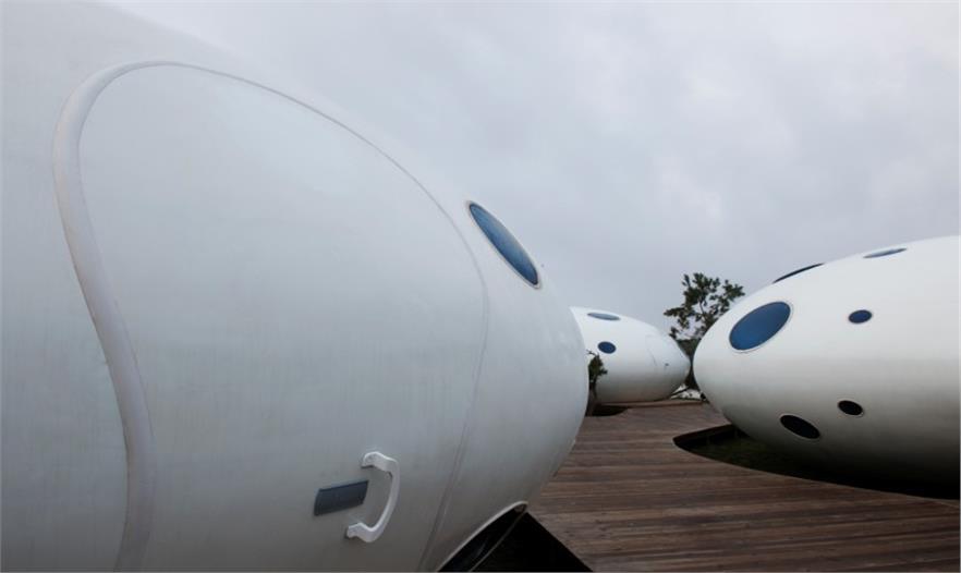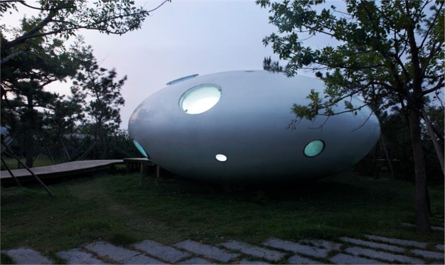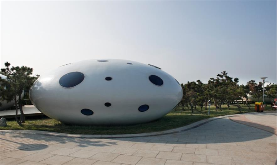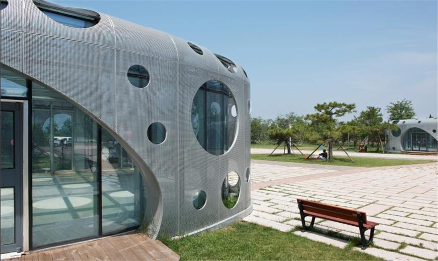 本案中的建筑猶如自然散落在海岸邊樹叢中的珍珠,創(chuàng)意取自海浪沖刷岸堤遺留下的水滴之意。建筑單體有五種尺度的模塊,分別為6米、7米、9米、12米、13米,根據(jù)不同的功能需求進(jìn)行組合,或八九成群,或二三成組,并隨地形高低錯(cuò)落。建筑具有輕盈的體態(tài)和施工快速的特點(diǎn),有效降低了對場地的破壞。并且采用了鋼結(jié)構(gòu),外立面為玻璃鋼,帶來珍珠般的圓潤質(zhì)感。四個(gè)廣場的建筑開窗形狀分別為圓形、水滴形、多邊形、三角形,提高各廣場的可識別性。依據(jù)不同季節(jié)風(fēng)向,計(jì)算出各建筑模塊的窗戶大小和開窗位置,使風(fēng)主要從東南面進(jìn)入建筑內(nèi)部,并從西北面排出,滿足自然通風(fēng)、采光充足的需求,也使建筑內(nèi)部具有獨(dú)特的光影效果,外立面則豐富活潑,在夜晚燈光照耀下,顯示出璀璨的星光效果。