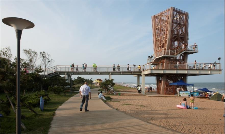 日照陽光海岸項(xiàng)目位于山東日照市碧海路以東,緊靠黃海西岸,占地面積81公頃,建筑面積5328平方米,建筑主要作為陽光海岸海濱浴場提供相應(yīng)的服務(wù)設(shè)施。規(guī)劃中將海濱浴場劃分為幾個(gè)主要區(qū)域:四個(gè)沿海岸分布的主題廣場(領(lǐng)航廣場、松濤廣場、星海廣場、乘風(fēng)廣場);餐飲服務(wù)區(qū);提供休閑步道和休憩場所等功能的靜態(tài)林下空間;提供迷宮、兒童游樂設(shè)施等活動(dòng)場所的動(dòng)態(tài)林下空間;提供更衣、餐飲、水上中心和相關(guān)服務(wù)設(shè)施的中心服務(wù)區(qū),所有區(qū)域均由木棧道和自行車道連接。