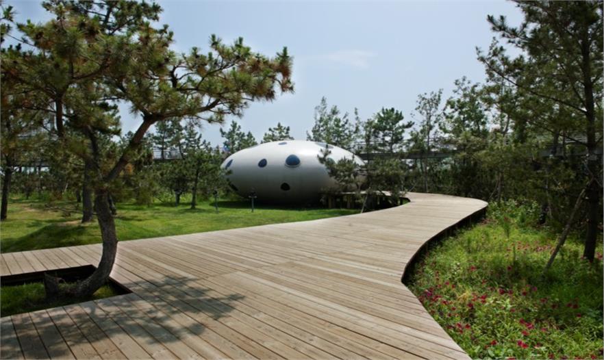 在景觀設(shè)計(jì)上,主創(chuàng)團(tuán)隊(duì)遵循生態(tài)優(yōu)先的原則,對海洋、海岸、植被等自然資源在保育的基礎(chǔ)上進(jìn)行再利用。對重要地段受到破壞的植被,以種植恢復(fù)為主,并選擇耐鹽堿、抗海潮風(fēng)的鄉(xiāng)土植物合理配置進(jìn)一步補(bǔ)充植被,采用三層復(fù)合式綠化結(jié)構(gòu),結(jié)合現(xiàn)狀林帶,形成近、中、遠(yuǎn)的植物景觀層次,使場地植被界面更為豐富。此外,波浪型擋墻及其他景觀設(shè)施不僅是提供休憩功能,也起了第二層沙壩的作用,可防止風(fēng)沙對建筑的侵蝕,阻隔沙子向內(nèi)陸的蔓延。