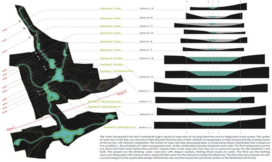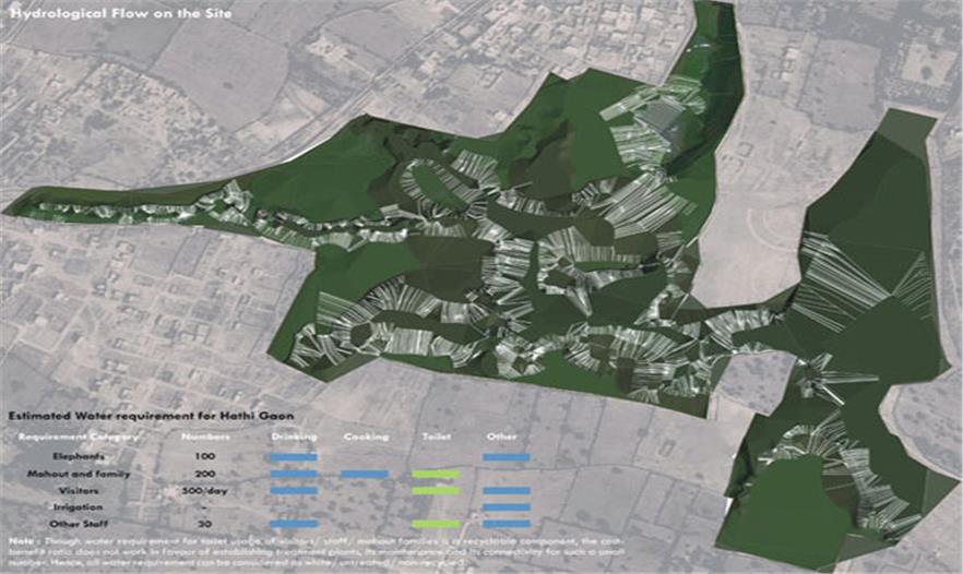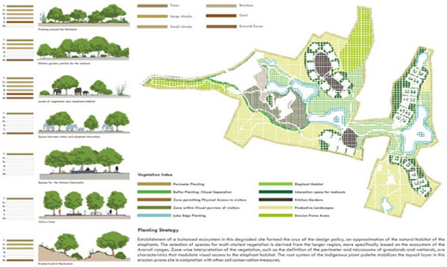 該總體規(guī)劃的主要目的是重新創(chuàng)建一個生態(tài)系統(tǒng),能夠使大象在身體和心理上感到舒適,孟買的建筑師Rahul Mehrotra和他的同伴被邀請來設計重建這個項目。該規(guī)劃將為一百頭大象建立一個棲息地,包括青壯年、幼仔、康復期的和衰老的大象以及它們的象夫(大象的飼養(yǎng)者)。允許有限的游客進入該區(qū)域參觀為發(fā)展帶來了必要的收入。車輛的進入僅限于入口和一個通向入口院子的人行道;一個半遮蔽的非正式廣場可以進行民俗表演。鄰近的低洼的濕地連接著廣場和游客走廊。游客的參觀區(qū)域僅限于走廊周圍,在那里人們可以看到牧場和大象洗澡的貯水池。大象的住處和他們的飼養(yǎng)者沿著該地高區(qū)分布,并向周邊排列成群。其他的建筑設施還有獸醫(yī)院和飼料商店。整個設計的核心是在這個退化的地區(qū)建立一個平衡的生態(tài)系統(tǒng),一個大象的自然棲息地。當?shù)刂参锏母悼梢苑€(wěn)定地表,以保持這個易受侵蝕的地方的水土不流失。