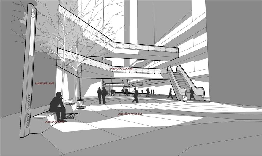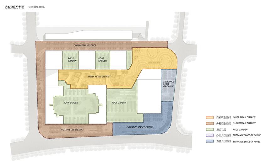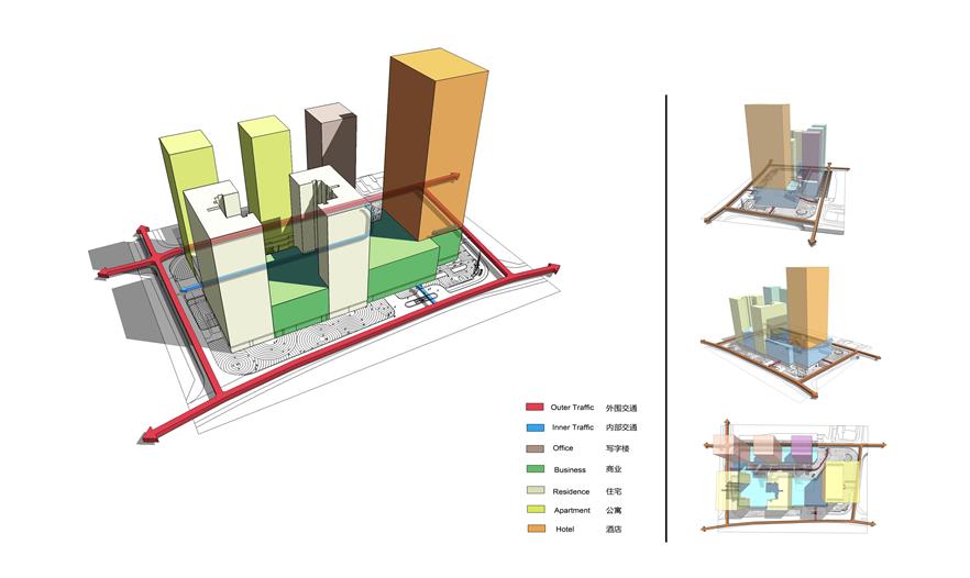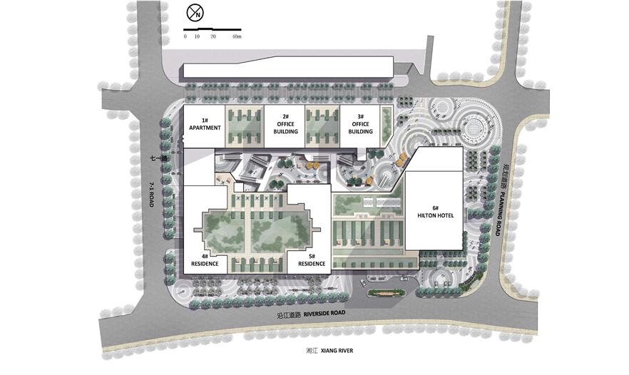 株洲希爾頓酒店項(xiàng)目為包含酒店,住宅,寫(xiě)字樓,商業(yè)多功能為一體的綜合體項(xiàng)目。其中,還包含一個(gè)內(nèi)商業(yè)街,并有部分設(shè)置空中廊道。對(duì)于景觀而言,空間功能需要多樣但又需要保持一定連續(xù)性。