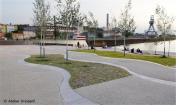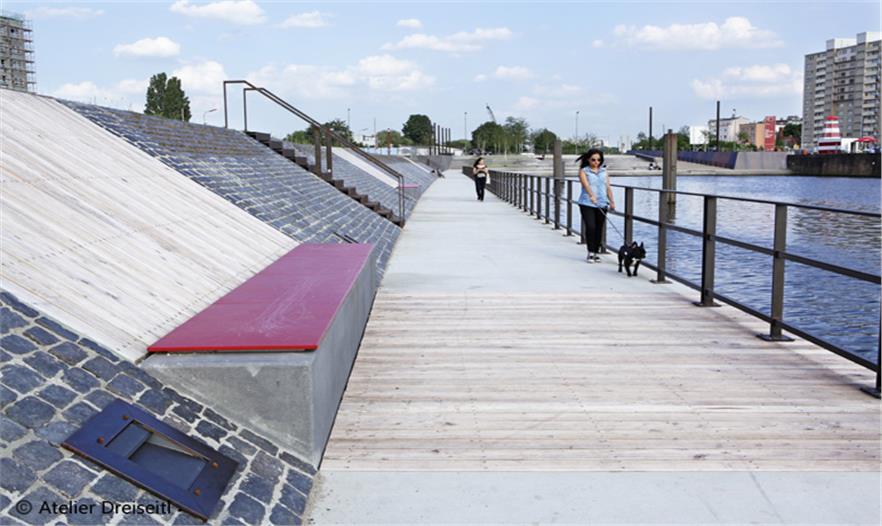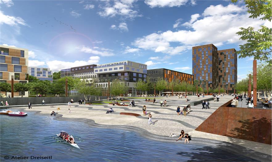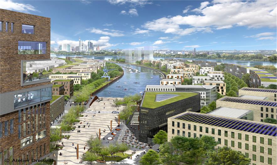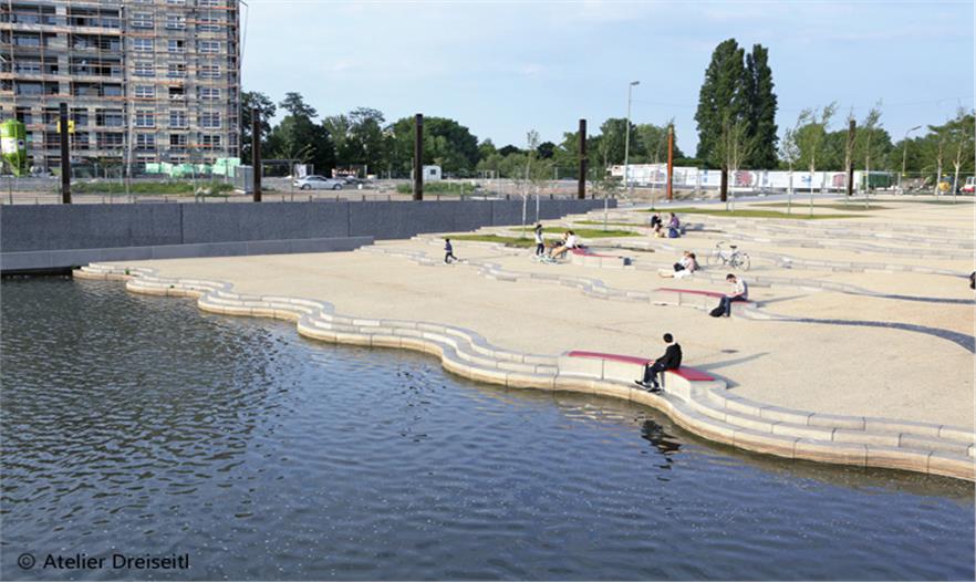 An industrial peninsular on the River Main is being converted into a new sustainable city district. The “harbour” forms the new urban focus with varied access to the water and multifunctional urban space. A promenade network connects the water to the more densely build-up area on one hand and to the new local park and regional river path beyond. In the challenging environment of contaminated soil, a holistic stormwater management concept has been developed to create soft city spaces and streetscapes while retaining and cleansing stormwater before releasing it to the river and harbour. Innovative natural water treatment systems such as cleansing biotopes are integrated into the park spaces, and new natural habitats are created for riparian flora and fauna whilst proving refreshing green oasis for the city. This project is a pragmatic vision for how climate adaptation can be achieved in urban context creating attractive neighbourhoods through integrated engineering. The project has prequalified for the prestigious DGNB Gold for a sustainable city district, comparable to a LEEDS Platinum rating, a European first.