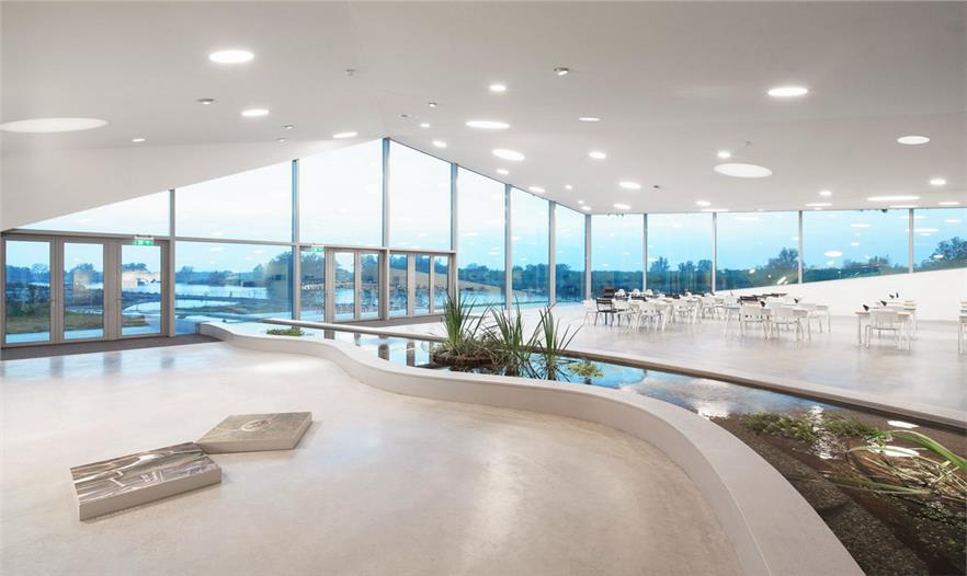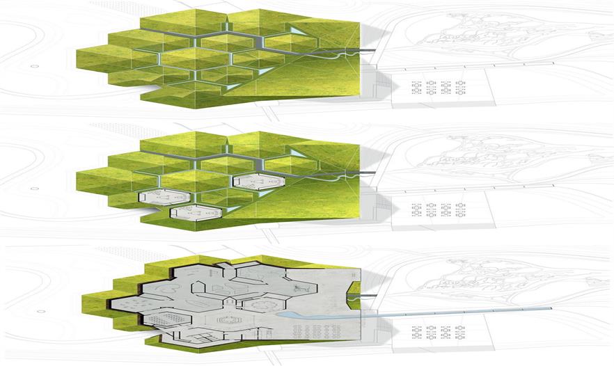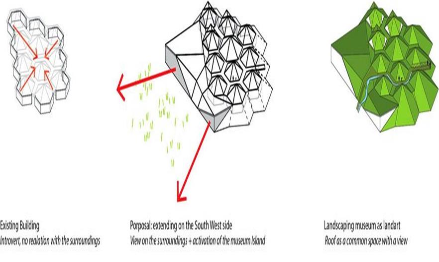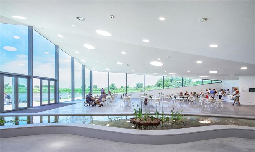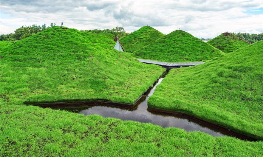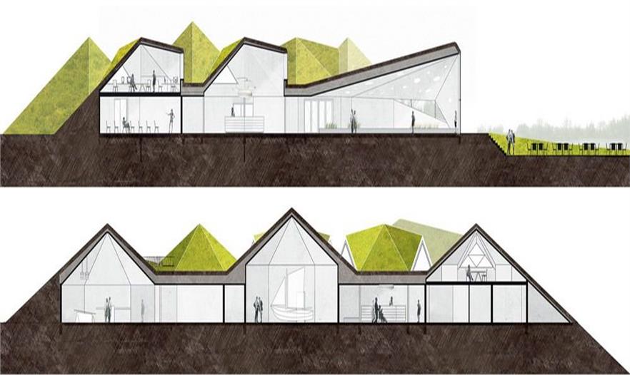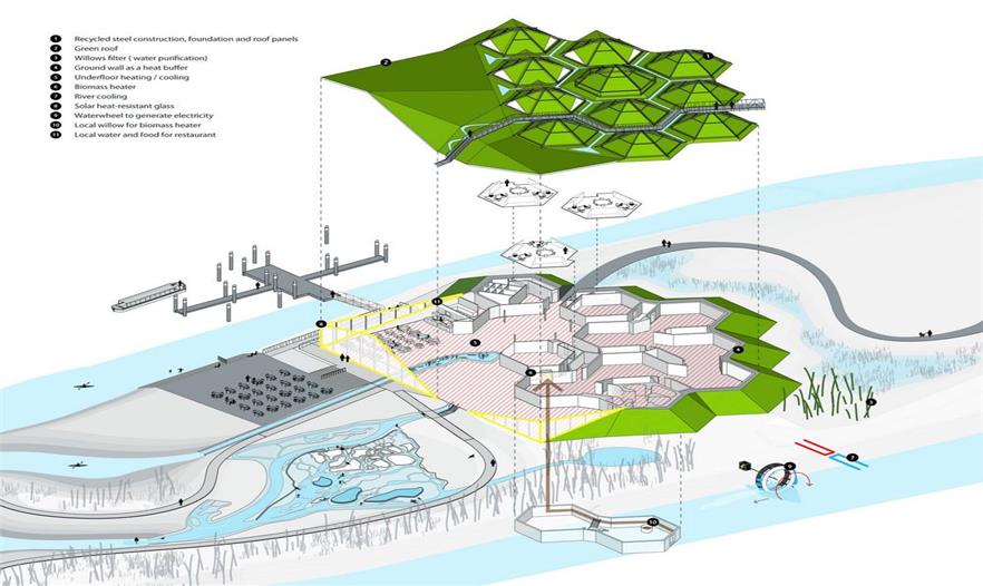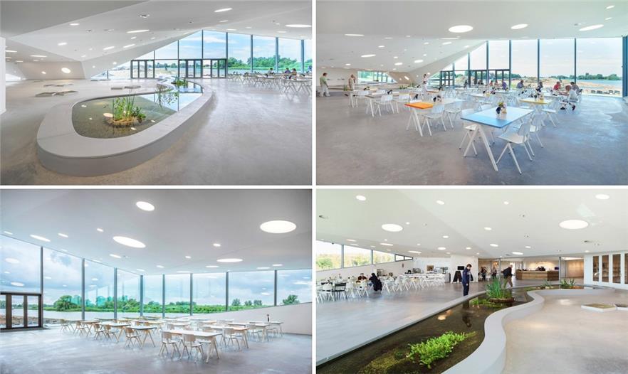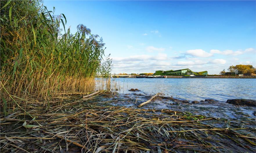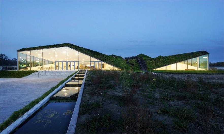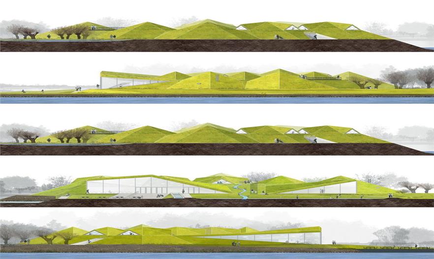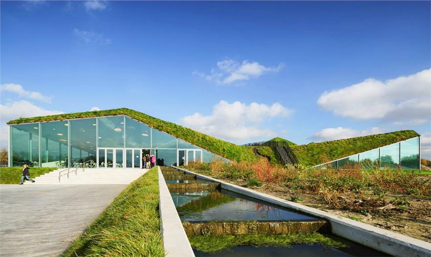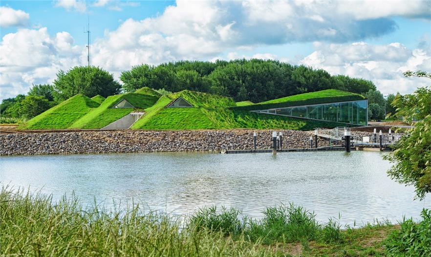 博物館島歷經(jīng)8個(gè)月的翻新改造得以重新向公眾開放。擴(kuò)建的新建筑面向自然景觀,具有一家餐廳和臨時(shí)的當(dāng)代藝術(shù)展覽空間。長(zhǎng)期性展館被完全升級(jí),講述了該地區(qū)的發(fā)展歷史。此外,一座大型的Biesbosch水體模型和淡水潮汐公園也在這座博物館島的規(guī)劃之中。為了避免不必要的材料和能源浪費(fèi),老博物館六邊形的結(jié)構(gòu)被得以保留,在它的西南部加蓋了一座1000平方米的新建筑。新建筑大面積的窗戶面向島上的花園,其中包含一家可以欣賞周圍美景的有機(jī)餐廳,以及臨時(shí)展覽空間。新老博物館建筑被大地景觀環(huán)繞,也被滿草的屋頂所覆蓋。事實(shí)上,屋頂增加了該地區(qū)的生態(tài)價(jià)值,為其營(yíng)造了可以稱之為大地藝術(shù)的雕塑,同時(shí)也使自身在環(huán)境中顯得格外引人注目。起伏的屋面上是小山一樣的景觀,其間鋪有小路,小路的盡端有一座可以瞭望景色的平臺(tái)。