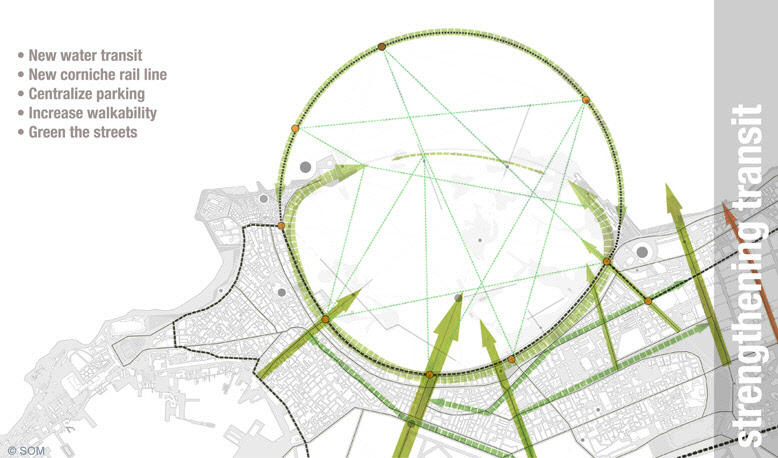 機(jī)動(dòng)性和流通性是設(shè)計(jì)的指導(dǎo)性原則。集中式的停車場(chǎng)減少了交通的擁堵,新的有軌電車、木板路、懸浮的碼頭、水上出租車提高了港口各部分的連通性。規(guī)劃計(jì)劃重建濱海路,并建造步行通道和遮陽(yáng)街道使整個(gè)城市更具環(huán)保的特征。古老的亞歷山德里亞圖書館被擴(kuò)建到了新的博物館區(qū)中,這里將是文化和學(xué)習(xí)中心,并臨近水域。