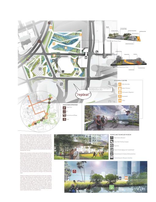 在跨城“活動(dòng)褶皺”和佛羅里達(dá)水族館之間,提案的中心元素是一個(gè)科學(xué)技術(shù)博物館,并附有一個(gè)新的交通設(shè)施。博物館園區(qū)內(nèi)有一個(gè)雨水和中水過濾區(qū)域。系統(tǒng)的特征是通過植物修復(fù)來凈化從雨洪排水管和周邊建筑收集的廢水,使其通過一系列過濾褶皺。博物館的教育重點(diǎn)通過標(biāo)注和講解員帶入到過濾褶皺之中,描述生態(tài)系統(tǒng)、處理原則和限制雨洪入河的益處。凈化后的水直接供給位于博物館園區(qū)北面和東面的工廠使用,在渠道一側(cè)地區(qū)建立了封閉循環(huán)工業(yè)系統(tǒng)的基礎(chǔ)。