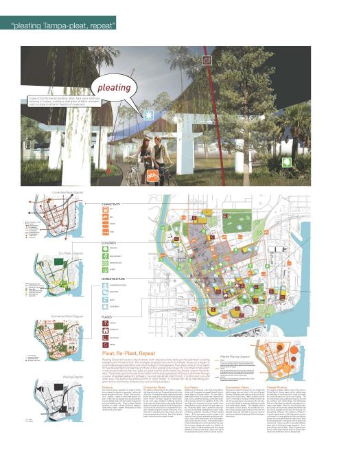 Tampa)將在城區(qū)現(xiàn)有的人力和基礎(chǔ)設(shè)施之上建立一座生機(jī)勃勃且活動(dòng)層次多樣的城市。提交的計(jì)劃也將把坦帕重塑為可持續(xù)能源時(shí)代和生態(tài)管理的領(lǐng)先者。四個(gè)區(qū)域?qū)⒆鳛樾麻_發(fā)和活動(dòng)、能源和生態(tài)分層的主要褶皺地點(diǎn):跨城區(qū)褶皺、新博物館區(qū)、河邊生態(tài)公園及西北的雨洪區(qū)域。這些區(qū)域通過一系列摺疊的步行道、公交車和快速有軌交通、一個(gè)中央公園區(qū)和零售軸線相互連接,并與坦帕現(xiàn)存的市區(qū)特色地點(diǎn)相連。提案的目標(biāo)是“摺疊坦帕”,通過增強(qiáng)計(jì)劃、基礎(chǔ)設(shè)施再展望和改良生態(tài)來重塑城市。