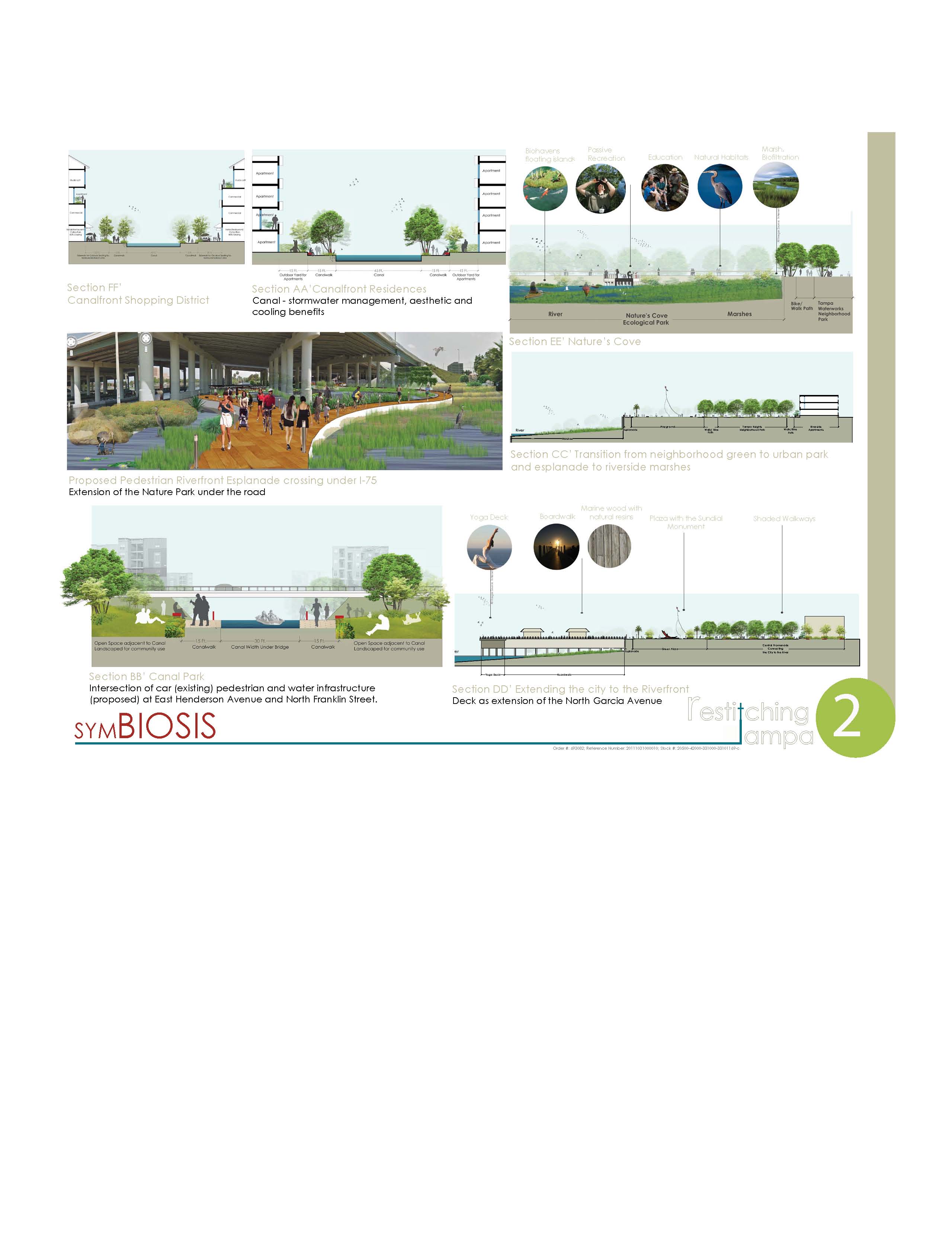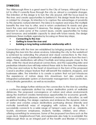 設(shè)計(jì)方案還建造了一條連續(xù)的步行棧道,路旁點(diǎn)綴著步行就能到達(dá)的獨(dú)特近水目的地。通過(guò)這種方式,與河流的聯(lián)系得到了增強(qiáng)。方案所提議的沿水濱的自然與城市環(huán)境融合為經(jīng)濟(jì)增長(zhǎng)、審美和視覺(jué)愉悅、娛樂(lè)、休閑、教育以及精神治愈創(chuàng)造出了巨大的機(jī)遇。設(shè)計(jì)方案抓住并接受了水的動(dòng)態(tài)本性,創(chuàng)造出了獨(dú)特的目的地,描繪了多種多樣的(友好并相互受益)與自然建立關(guān)系的方式。通過(guò)這些它成功地連接上了坦帕市的一大部分使用者——例如居民、游客、城市雇員、學(xué)生、家庭、兒童以及其他人——并為每個(gè)人提供了一些東西。提出的部分功能,如瑜伽平臺(tái)、地區(qū)公園、步行棧道也有助于把希爾斯伯勒河重建成坦帕居民的健康和生活方式的一部分??偟膩?lái)說(shuō),這個(gè)設(shè)計(jì)方案從不同的角度結(jié)合了各個(gè)重要要素——連接、生態(tài)和基礎(chǔ)設(shè)施,創(chuàng)造出了一種與河流共生的關(guān)系。這種關(guān)系創(chuàng)造出了機(jī)遇,不僅能夠糾正我們過(guò)去開(kāi)發(fā)中的一些錯(cuò)誤,還能提升現(xiàn)時(shí)的生活質(zhì)量。此外,這個(gè)設(shè)計(jì)方案還是重新定位坦帕市的嘗試,以高效應(yīng)對(duì)一些未來(lái)的挑戰(zhàn),如氣候變化、洪水侵襲和海平面上升等。