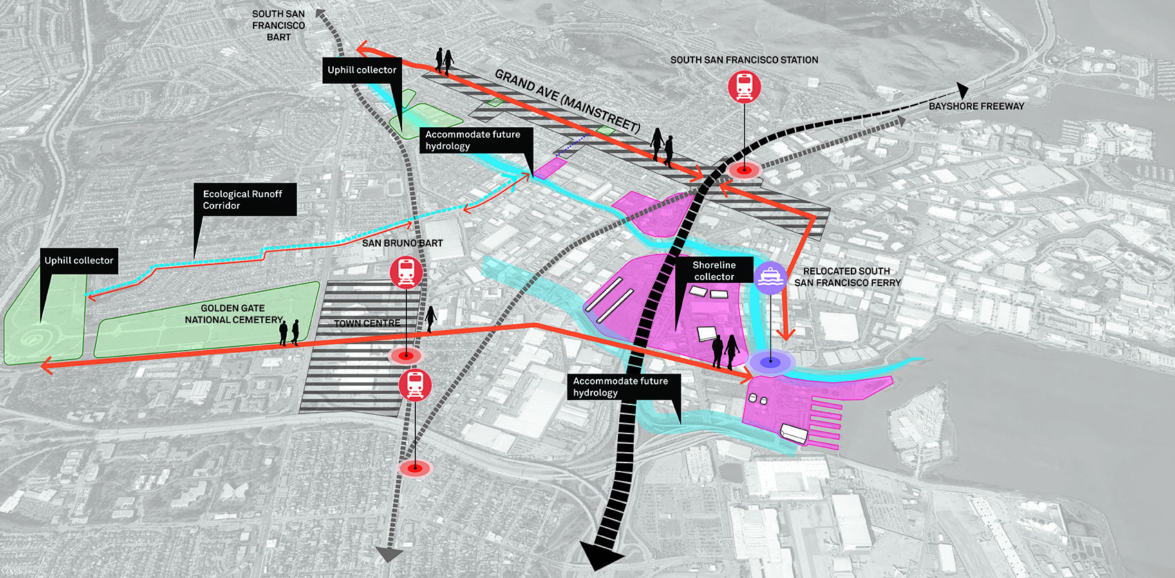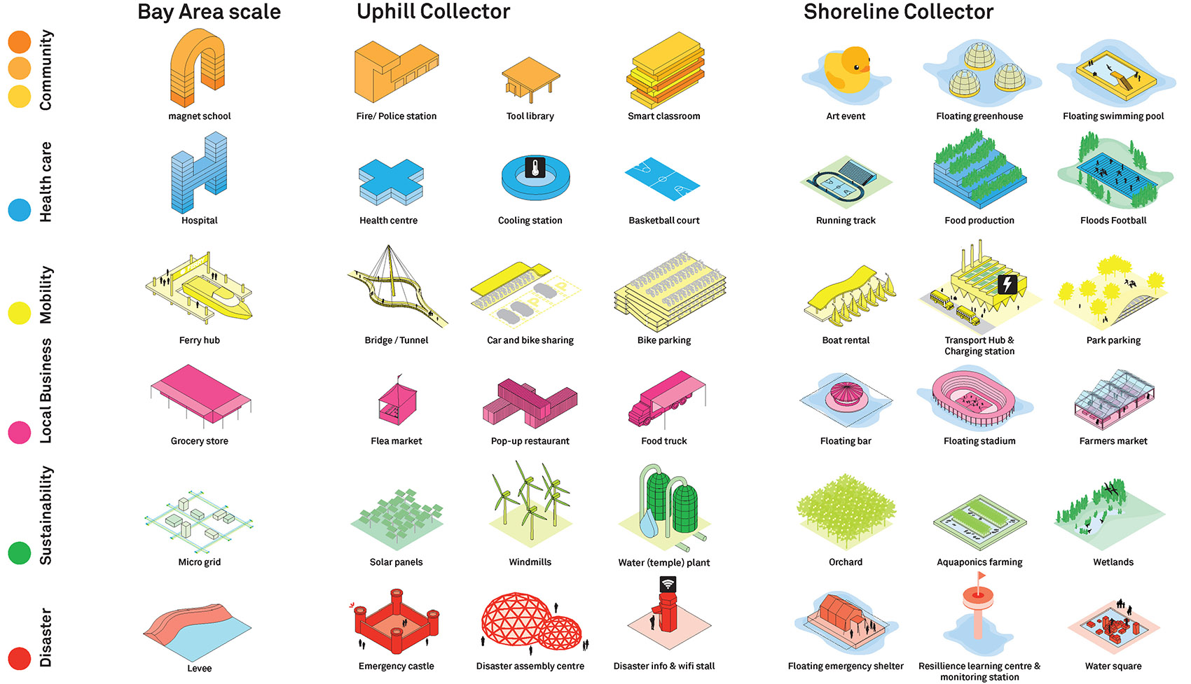 在競(jìng)標(biāo)的初期合作階段,HASSELL等設(shè)計(jì)團(tuán)隊(duì)構(gòu)想了一系列生機(jī)盎然的舊金山濱水社區(qū)形態(tài)。這些構(gòu)想中的社區(qū)不僅滿足人們?nèi)粘I畹乃行枨?,還對(duì)自然環(huán)境保護(hù)和災(zāi)害應(yīng)急處理做出回應(yīng)。不論是1906年美國歷史上最具災(zāi)難性的舊金山大地震,還是近年發(fā)生的北加州森林大火,公共空間都為這些自然災(zāi)害提供了最有利的庇護(hù)之所。而設(shè)計(jì)師的設(shè)計(jì)出發(fā)點(diǎn),正是基于公共空間的這一特性。在HASSELL等設(shè)計(jì)團(tuán)隊(duì)的規(guī)劃藍(lán)圖下,一個(gè)由綠地、溪水和高架公路等組成的結(jié)構(gòu)系統(tǒng),從山脊線開始貫穿輪渡碼頭直抵濱海沿線,為穿行區(qū)域提供連接、集聚和水處理工程。道路和小溪成為了社區(qū)環(huán)境的連接器,和聚集環(huán)境的應(yīng)答器,而散布其中的開放空間將成為娛樂、集會(huì)、公共活動(dòng)和避難疏散的開放空間。在這些設(shè)施的共同作用下,該地將最終變?yōu)槲锢憝h(huán)境和社會(huì)環(huán)境下的可恢復(fù)性空間。