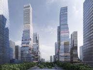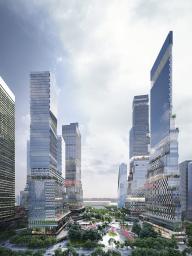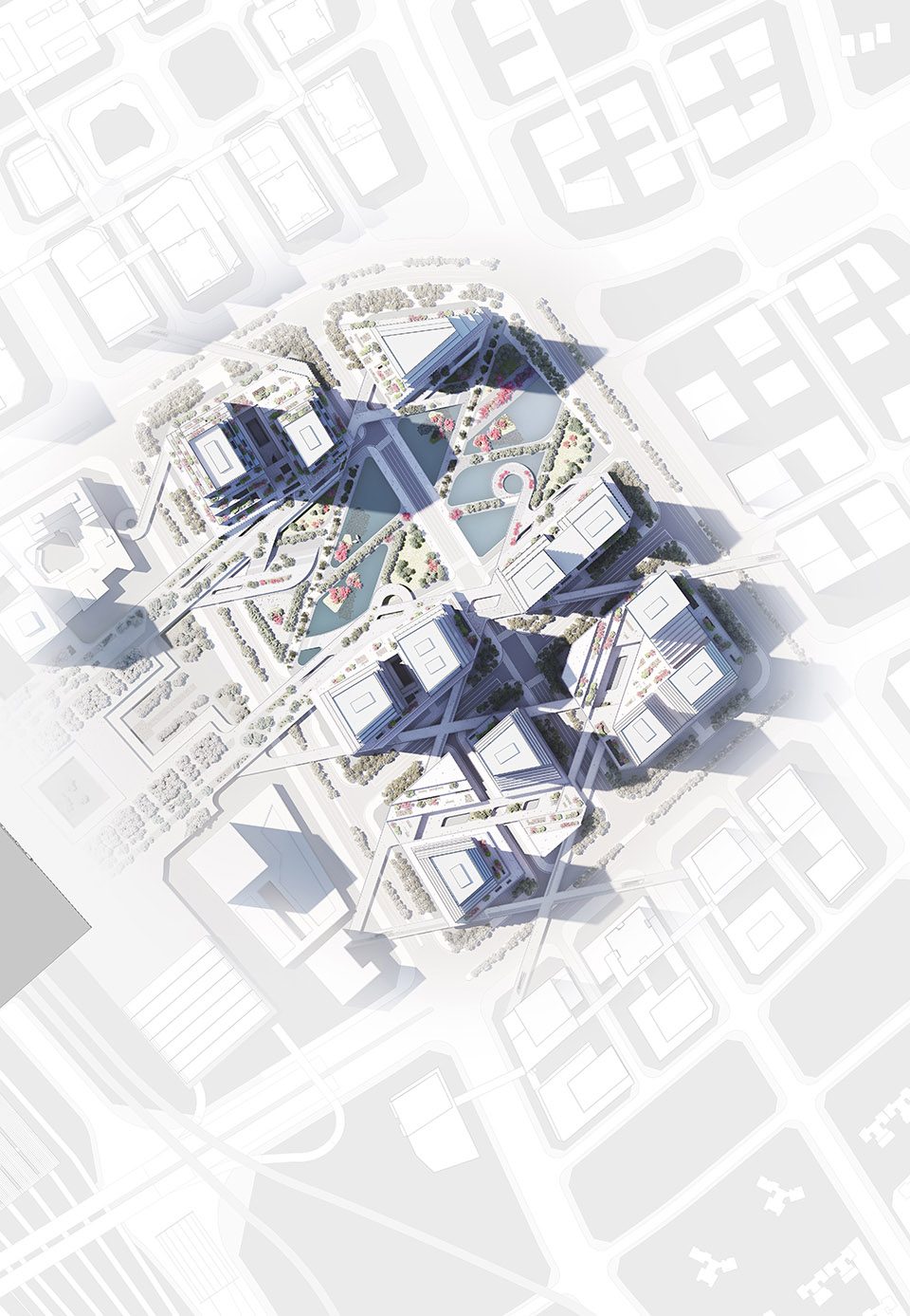 設(shè)計(jì)希望創(chuàng)造一個(gè)強(qiáng)烈的區(qū)域標(biāo)識(shí)。商務(wù)區(qū)主要的建筑圍繞一座中央城市公園設(shè)立,高度從278米到428米不等。主要的交通節(jié)點(diǎn)被設(shè)在地下,保證公共公園的開(kāi)放性,彌補(bǔ)了該地區(qū)在開(kāi)放的綠色空間方面的缺失。