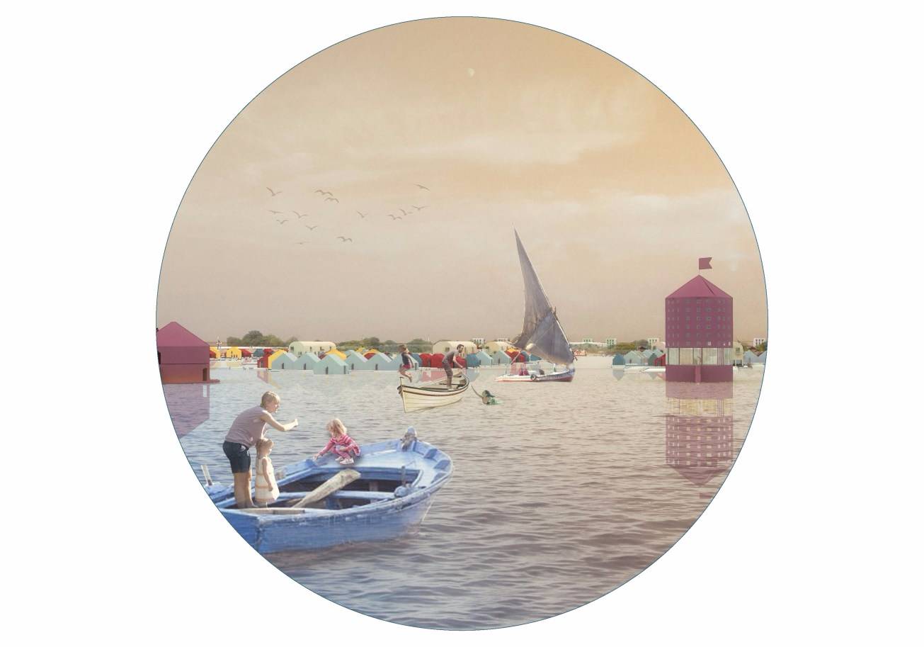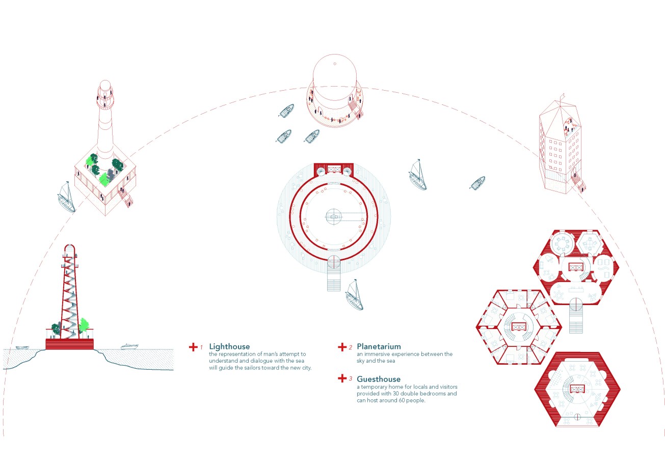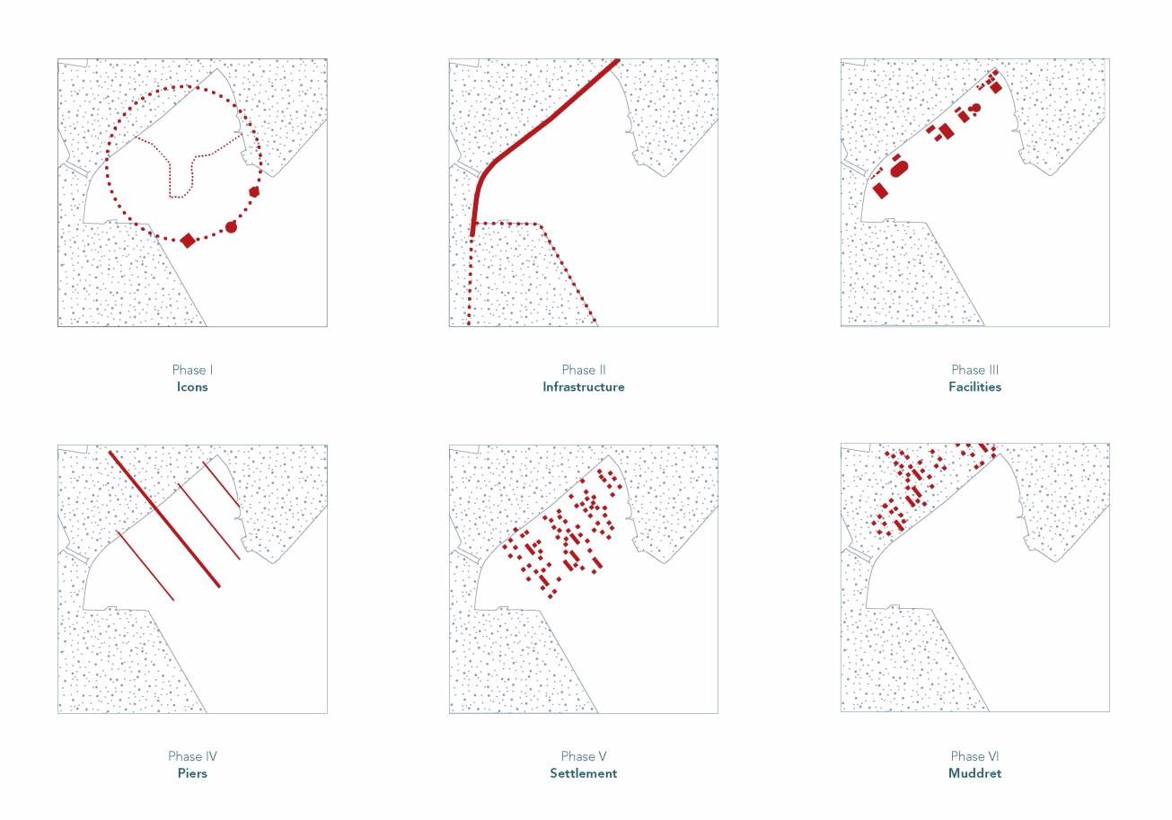 第一階段:首先要重新組織哈托爾曼的海岸線,并在現(xiàn)有場地上建造一個防波堤,這樣可以創(chuàng)造一個新的入海口,保護新城市的發(fā)展。入口處的地方設(shè)置有“立柱”等從海面上升起的標(biāo)志性元素。