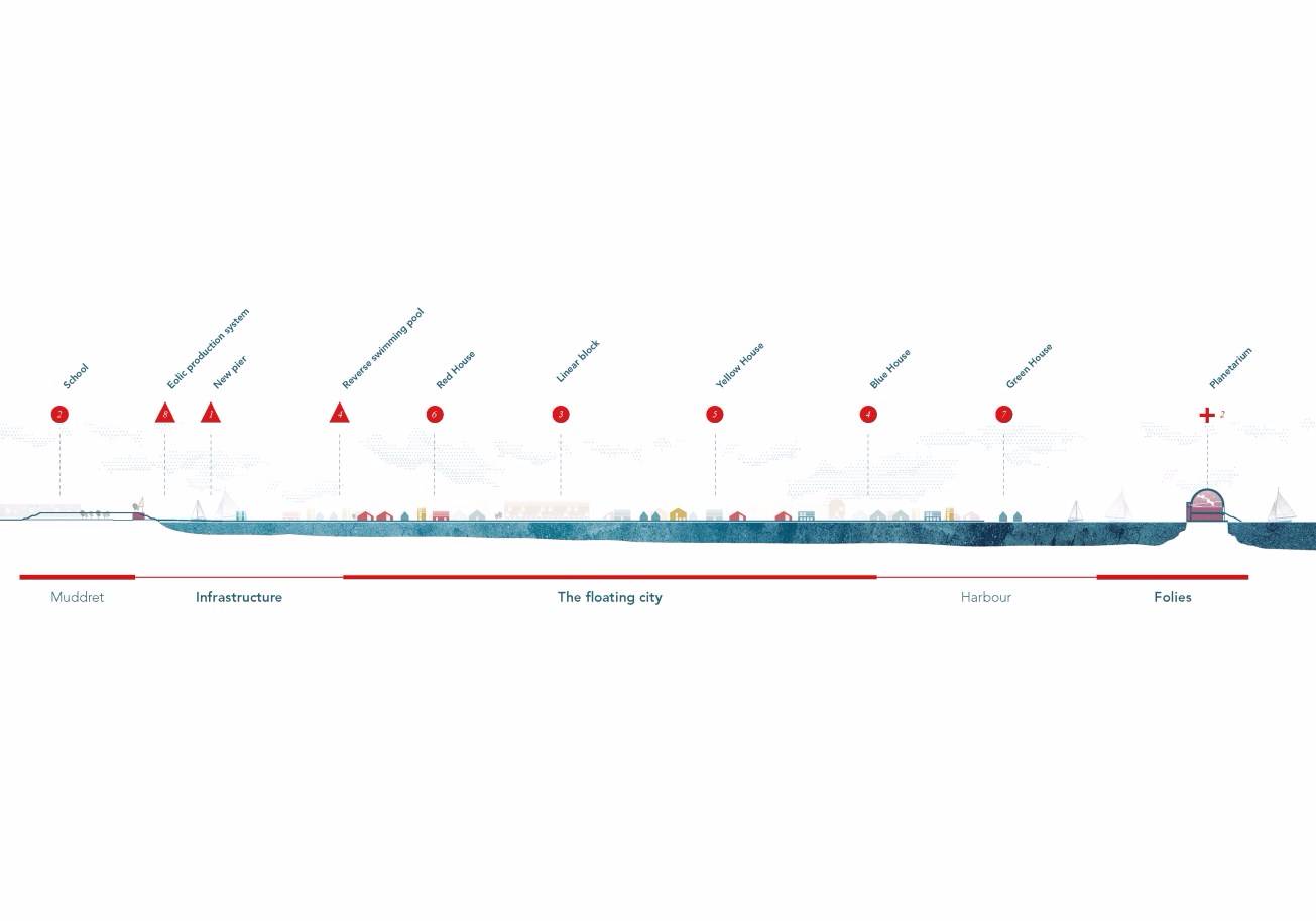 漂浮城市遵循城市格網(wǎng)(50x70m)的設(shè)計原則,使用現(xiàn)有建筑物形成的框架以模塊化的方式進行組織。為了使這個方案具有可行性,在其實施過程中明確階段性非常重要。城市階段性是通過臨時性的干預(yù)手段和各個元素的流動性所決定的,它們根據(jù)其位置的時間變化進行組織。