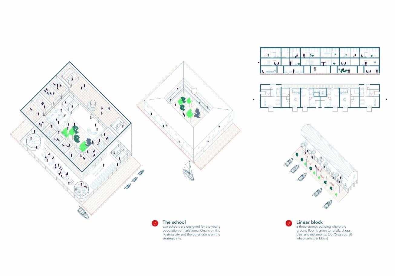 學(xué)校:兩所學(xué)校是為卡爾斯克魯納年輕一帶設(shè)計的。一個在漂浮城市中,另一個在岸上。