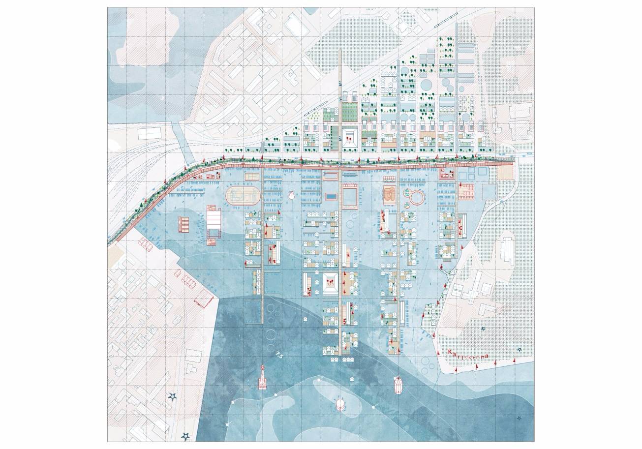 想要恢復(fù)生產(chǎn)性,對我們來說首先要理解城市肌理,然后將項目和它周圍的環(huán)境重新聯(lián)系起來。我們將大海看作是本次項目的主題,總共32公頃的用地,其中有20公頃都是水域??査箍唆敿{群島由30個島組成,它們之間都是通過海水連接的。海洋成為一個新的城市平臺,水的存在使城市元素更加靈活而具有可移動性。我們想給人們提供一種可能性,讓他們自己塑造與城市之間的關(guān)系,然后充分享受其中。