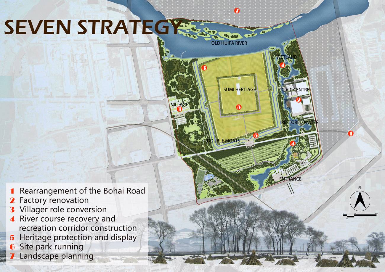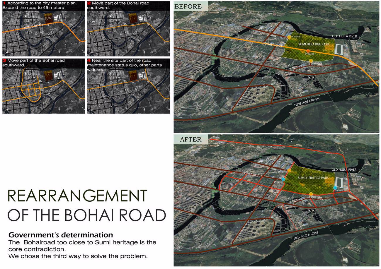 渤海大道和遺址之間的距離過近是本次公園規(guī)劃的核心矛盾。經(jīng)過與政府的多次溝通,渤海大道南移的方案獲得政府的大力支持,以降低對遺址的干擾。通過一小段新的道路的建立,將南側(cè)村莊與公園之間產(chǎn)生直接連通,增加遺址與南側(cè)新城之間的聯(lián)系。近期,渤海大道維持現(xiàn)狀,遠(yuǎn)期作為公園內(nèi)部道路使用。