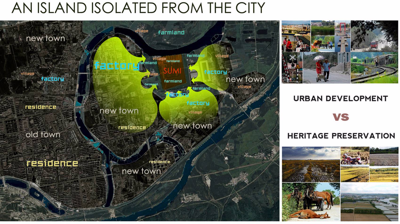 鐵路、高壓線、地下采礦、工廠的修建與遺址爭奪空間。村民將水系的截?cái)?,進(jìn)行水稻田生產(chǎn)灌溉,遺址周邊的自然山水環(huán)境被破壞。遺址與城市之間關(guān)系變得僵硬,逐漸成為城市邊緣的孤島。