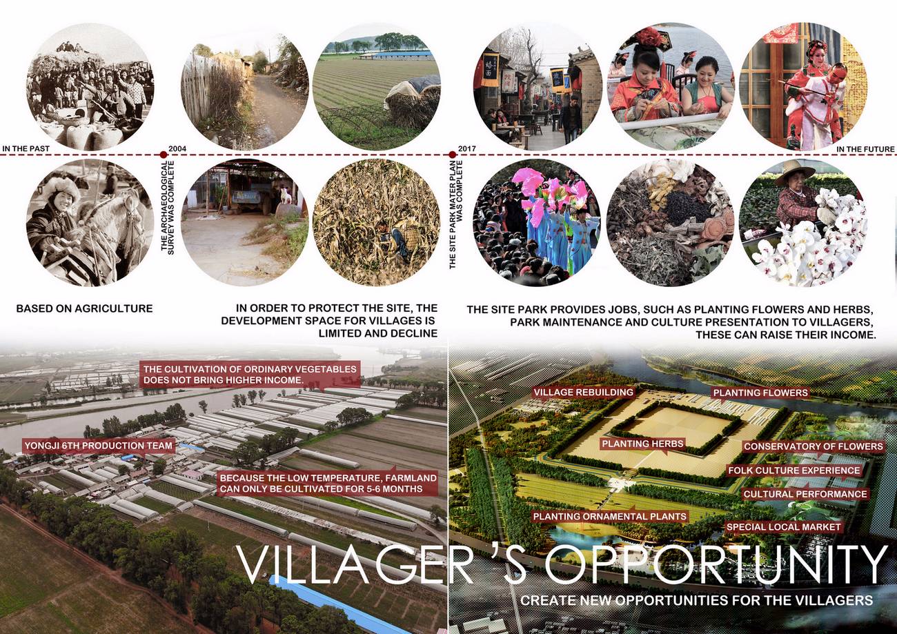 共有200位村民生活在遺址公園內(nèi)。他們以蔬菜種植作為主要的收入來源。本次規(guī)劃將村民的收入結(jié)構(gòu)從單一的農(nóng)業(yè)作物種植,擴(kuò)展到公園維護(hù)、小商品售賣、展示演出、售票等多種途徑。收入的增加極大提高了村民保護(hù)遺址的積極性。