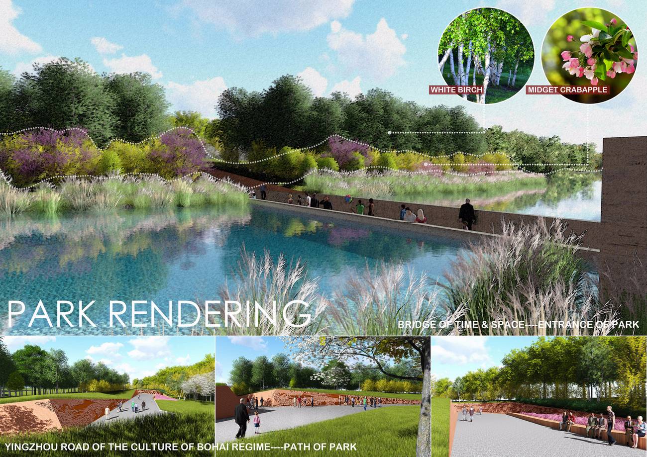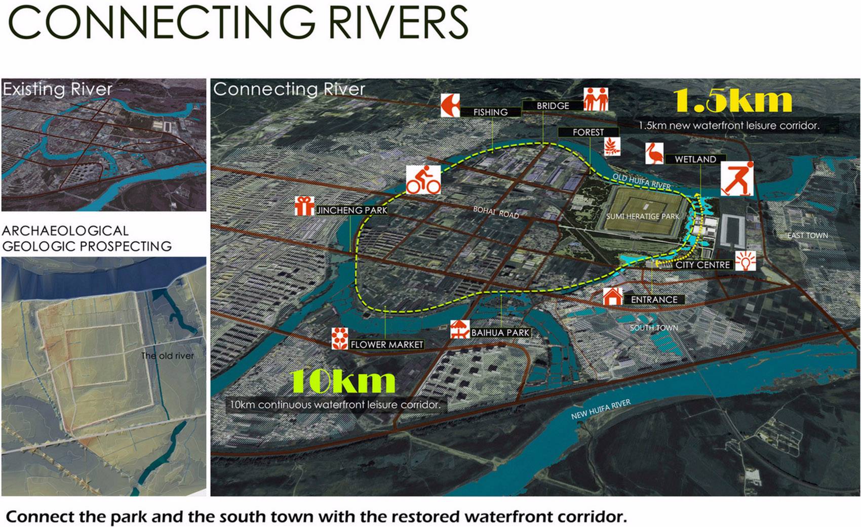 通過考古勘探,在遺址東側(cè)和南側(cè)分布有原有河道。本次規(guī)劃對原有河道進(jìn)行恢復(fù),將輝發(fā)河與輝發(fā)河故道連接起來,形成城市東側(cè)的10km環(huán)形連續(xù)生態(tài)休閑廊道。恢復(fù)的河道在南側(cè)新城和輝發(fā)河故道之間提供了一個(gè)1.5km的濱水生態(tài)路徑,串聯(lián)工廠改造區(qū),有利于將人氣引入公園北側(cè)。