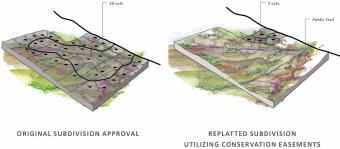 除了核心區(qū)域之外,團(tuán)隊(duì)還確定了第二組具有針對(duì)性的保護(hù)場(chǎng)地,以便在不破壞自然資源的前提下建造有限的建筑集群。為了使該目標(biāo)能夠成功實(shí)現(xiàn),項(xiàng)目團(tuán)隊(duì)需要證明開放空間對(duì)于社區(qū)開發(fā)的種種益處,以及保留額外土地對(duì)于提升周邊土地價(jià)值的積極作用。這樣一來,走廊中所需要開發(fā)的住宅單元數(shù)量以及需要花錢購買的開放空間數(shù)量均得以減少。