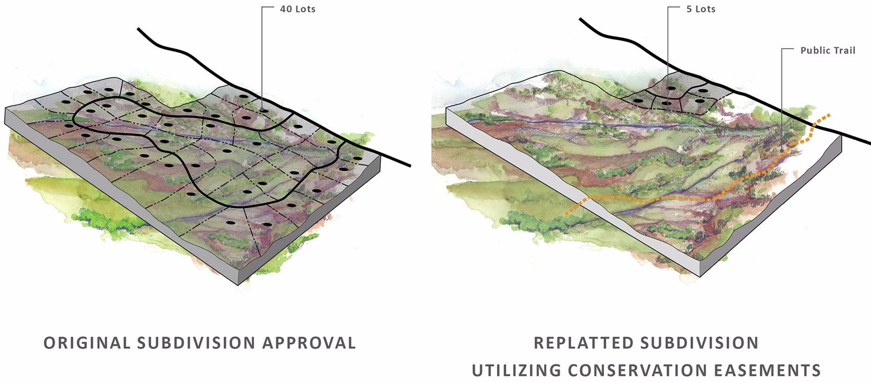 在將“遠(yuǎn)景規(guī)劃”變?yōu)楝F(xiàn)實(shí)的過程中,土地交易方面的復(fù)雜問題也在不斷增加。為了使項(xiàng)目得以落實(shí),自然保護(hù)基金也對(duì)項(xiàng)目進(jìn)行了干預(yù),購得了走廊沿線1300英畝的土地,為公眾帶來望向派克峰的優(yōu)越視野。目前已經(jīng)在實(shí)施的40棟房屋的道路和基礎(chǔ)設(shè)施建設(shè)更突顯了保護(hù)工作的緊迫性。景觀設(shè)計(jì)師通過草圖展示了坐落在敏感區(qū)域的住宅建筑群,并借此說服開發(fā)商重新進(jìn)行規(guī)劃,從而有效地將住宅建筑從公共視野中移除。這一最后關(guān)頭的舉措對(duì)項(xiàng)目的成功落實(shí)起到了至關(guān)重要的作用。