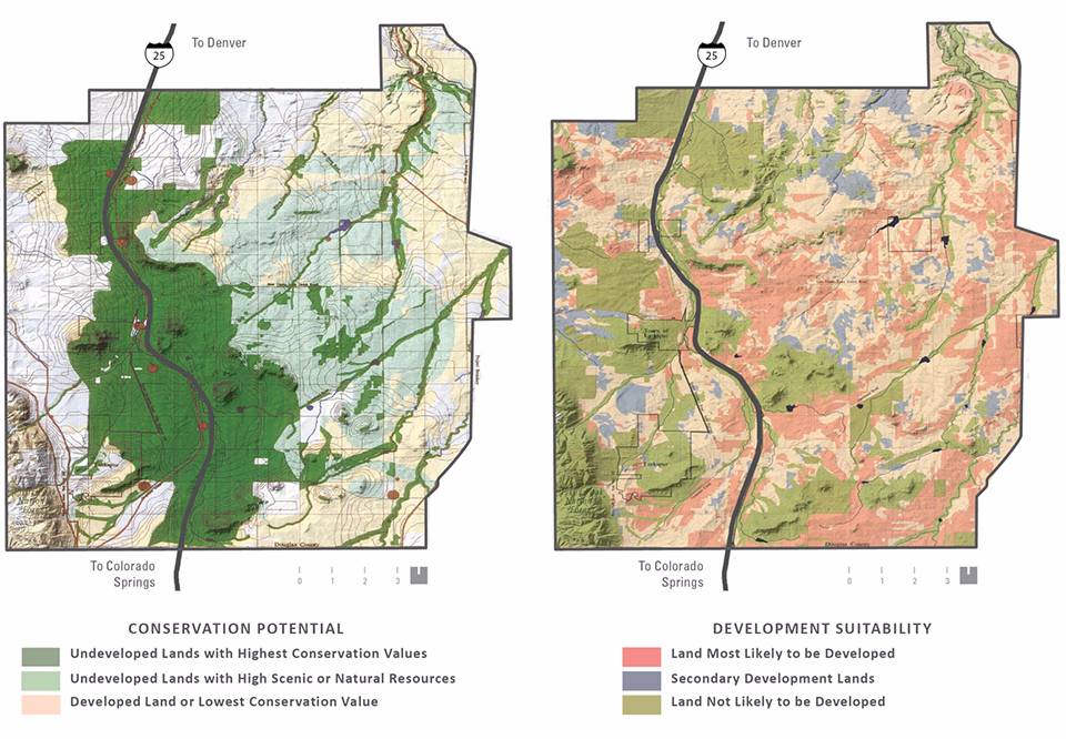 ▲發(fā)展模式與預(yù)測(cè)。I-25走廊沿線的無序發(fā)展促使環(huán)保組織、土地信托組織、當(dāng)?shù)厣鐓^(qū)、道格拉斯縣政府和州政府部門共同組成了一個(gè)前所未有的聯(lián)盟,旨在為落基山脈的前山區(qū)域提供保護(hù)。