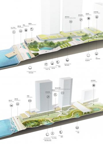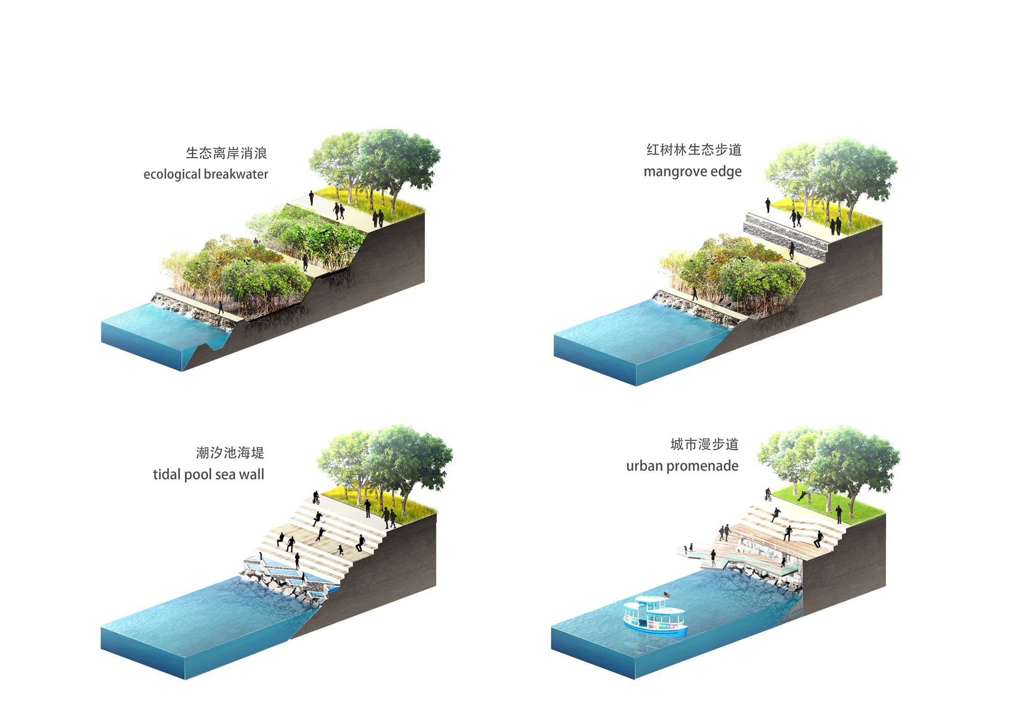 項(xiàng)目建設(shè)在填海土地之上,在提供了一個(gè)難得機(jī)遇的機(jī)會(huì)同時(shí),也賦予了一個(gè)重大責(zé)任:要確保開發(fā)建設(shè)能與一個(gè)強(qiáng)大的可持續(xù)生態(tài)系統(tǒng)和諧共生??紤]到這一點(diǎn),彈性規(guī)劃作為核心原則融入了項(xiàng)目設(shè)計(jì)中的各個(gè)方面。從自然規(guī)劃的角度上來講,上升的海平面是影響設(shè)計(jì)的最主要因素。氣候模型預(yù)計(jì)馬來西亞南部的海平面將于2100年上升0.2至0.8米。森林城市海岸邊界的設(shè)計(jì)為能夠消減日益增大的風(fēng)暴影響,同時(shí)為景觀提供了不會(huì)受未來海水上升影響的必要發(fā)展空間。臺(tái)階式地形不僅能為生物提供棲息地,還可以容納上升的海水??紤]到未來100年中高潮岸線的上升對(duì)于景觀的影響,項(xiàng)目面積的4%被劃定為平緩上升的海濱保留帶。