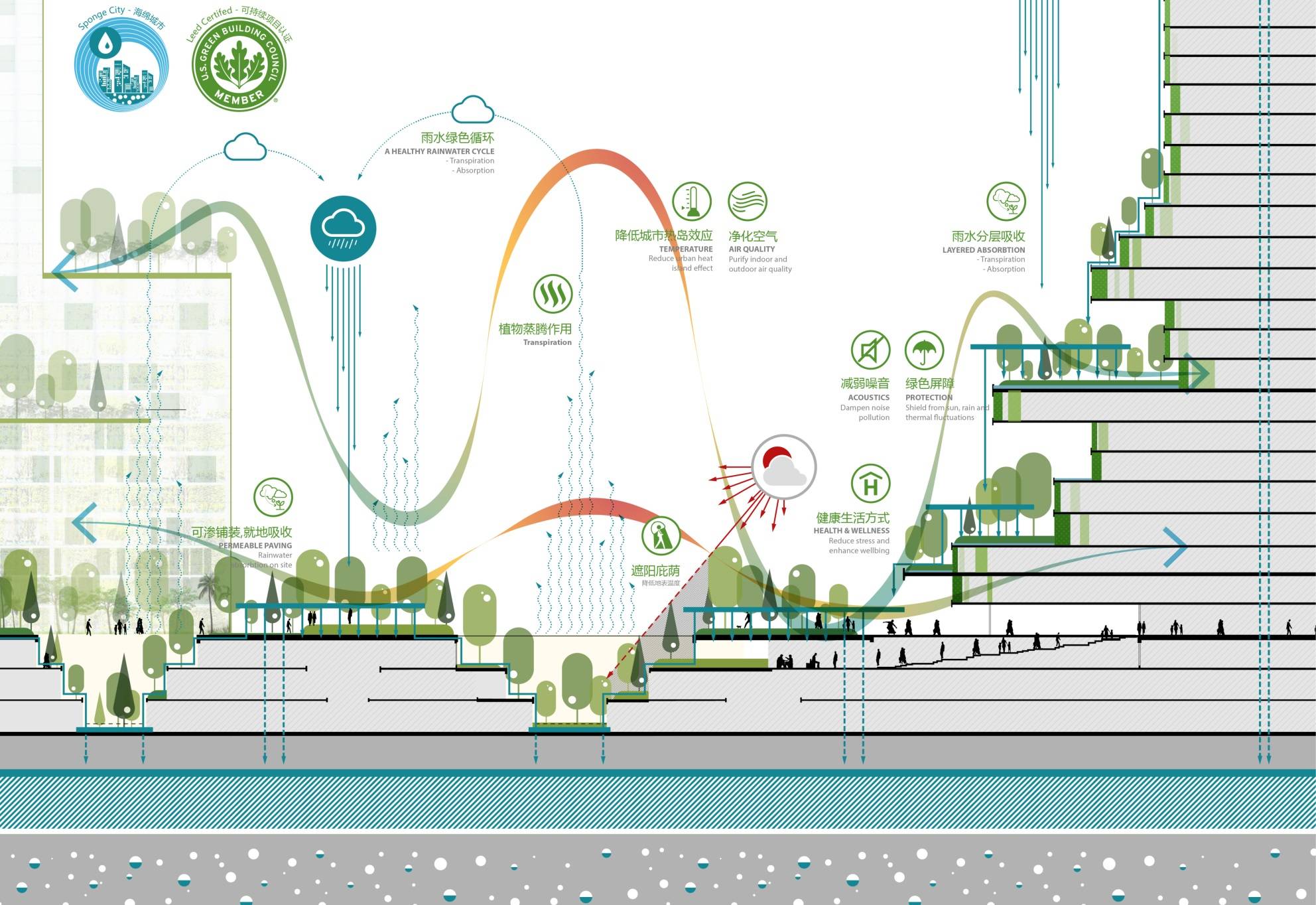 建筑平臺(tái)層的設(shè)置為景觀基礎(chǔ)設(shè)施的整合提供了多種可能性。平臺(tái)上的樹木可將周邊溫度降低2-3攝氏度,綠色植生墻則可以凈化室內(nèi)外的空氣質(zhì)量。這些景觀還能收集雨水,供抽水馬桶和其它非飲用用途使用。