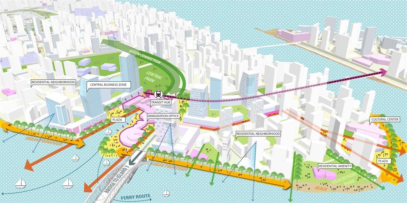 城市建設(shè)采取混合功能的開發(fā)方式,把生活和工作安排在緊湊、適宜步行的多功能都市環(huán)境中,同時(shí)將一系列多樣化的公共、文化和娛樂設(shè)施置于一片繁茂的、具有熱帶風(fēng)情的景觀里,令森林城市成為新一代馬來西亞人的理想之地。隨著多種公共交通模式的建立,森林城市得以與世界連通。這其中包括一個(gè)龐大的航運(yùn)網(wǎng)絡(luò)、同新加坡捷運(yùn)系統(tǒng)相連的輕軌交通系統(tǒng)以及馬來西亞擬在建設(shè)的直達(dá)吉隆坡的高鐵線路。