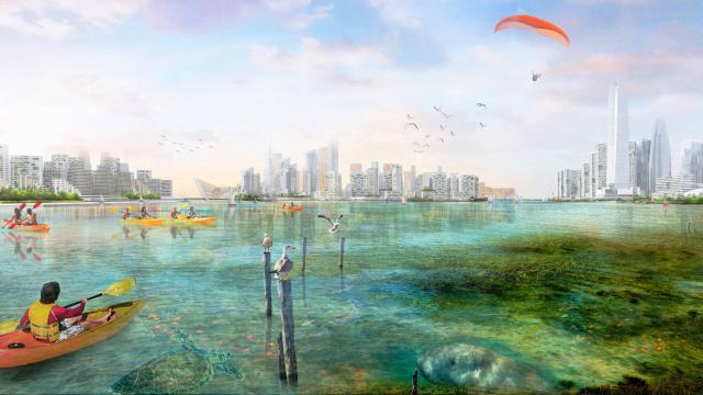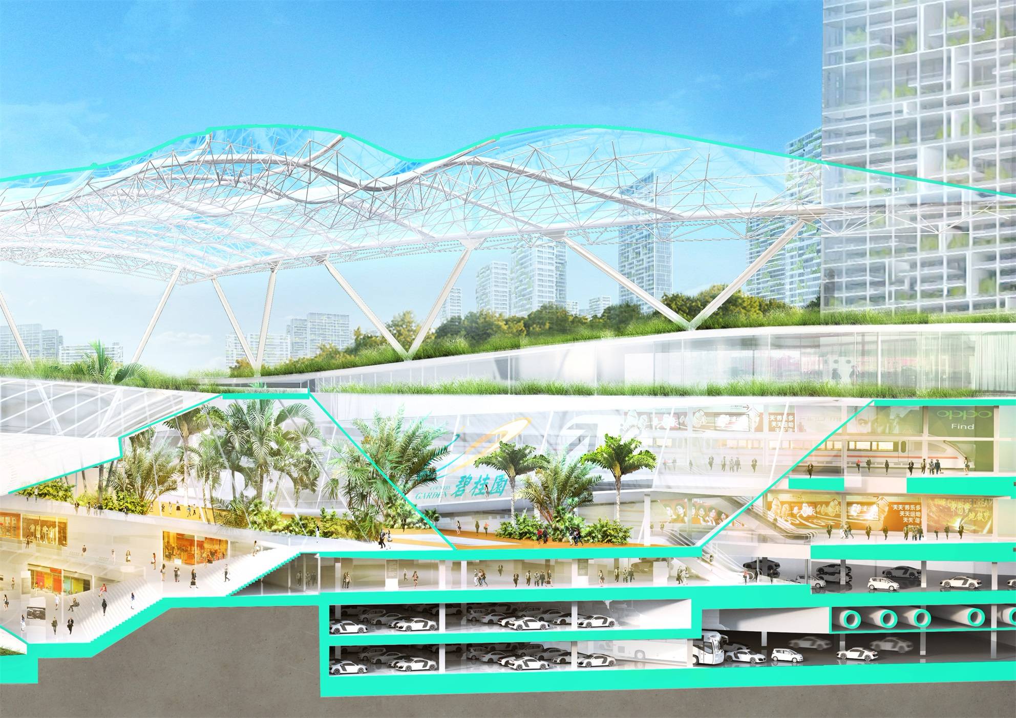 項(xiàng)目填海目的是為了打造適宜步行的環(huán)境,而基礎(chǔ)設(shè)施將建于地下。森林城市多層結(jié)構(gòu)的系統(tǒng)在設(shè)計(jì)時(shí)對(duì)步行通行給予了優(yōu)先考慮。與車輛交通相關(guān)的基礎(chǔ)設(shè)施位于地面層,與此同時(shí),一個(gè)連續(xù)的景觀在基礎(chǔ)設(shè)施平臺(tái)的頂層也創(chuàng)建了可以便于達(dá)到交通站點(diǎn)的公共空間。