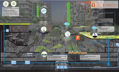 上升的濱水沿岸為城市設(shè)計(jì)提供了積極的解決方案。這種方案為公共領(lǐng)域展示了一種新范式——400萬平方米的連續(xù)屋頂景觀不僅將所有的發(fā)展地塊串聯(lián)在一起,同時(shí)還可容納雨水、重建當(dāng)?shù)氐臈⒌貐^(qū)域、過濾雨水徑流,并提供了一個(gè)無機(jī)動(dòng)車的娛樂體驗(yàn)場所。