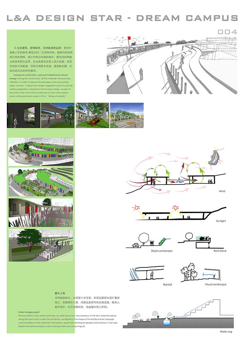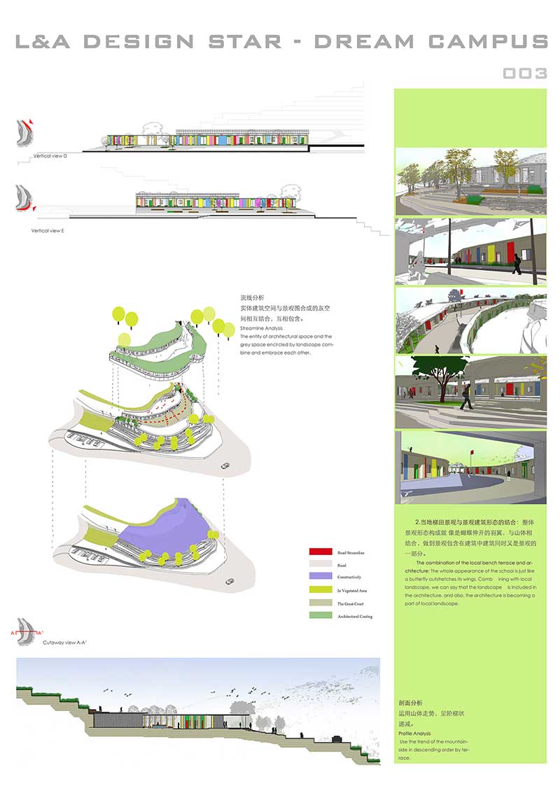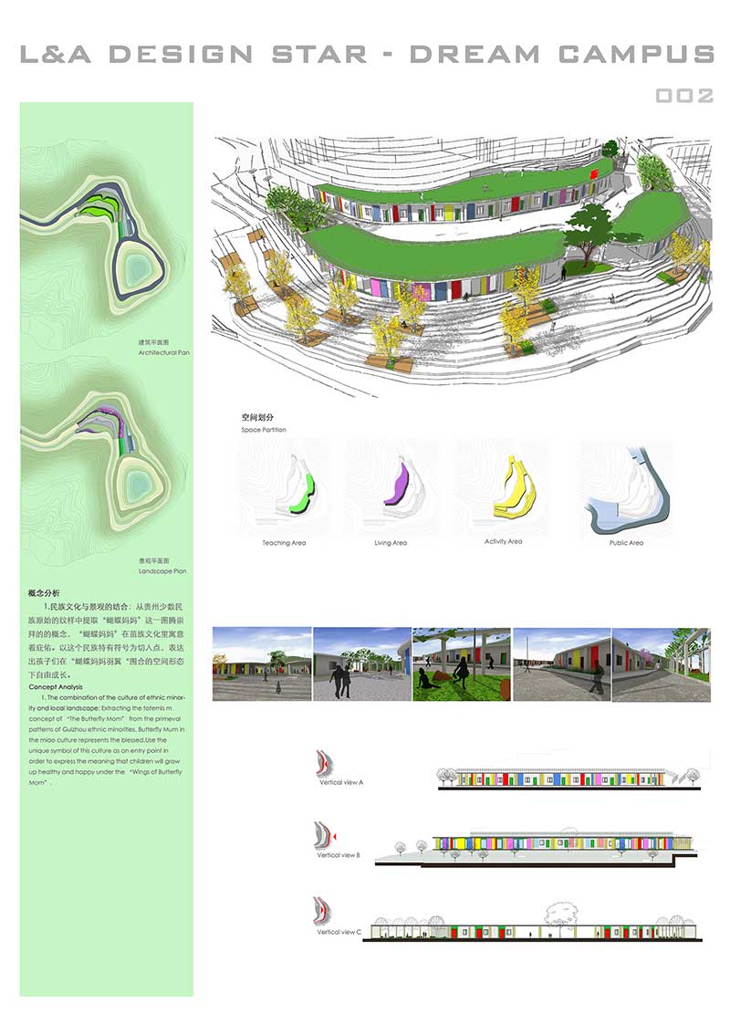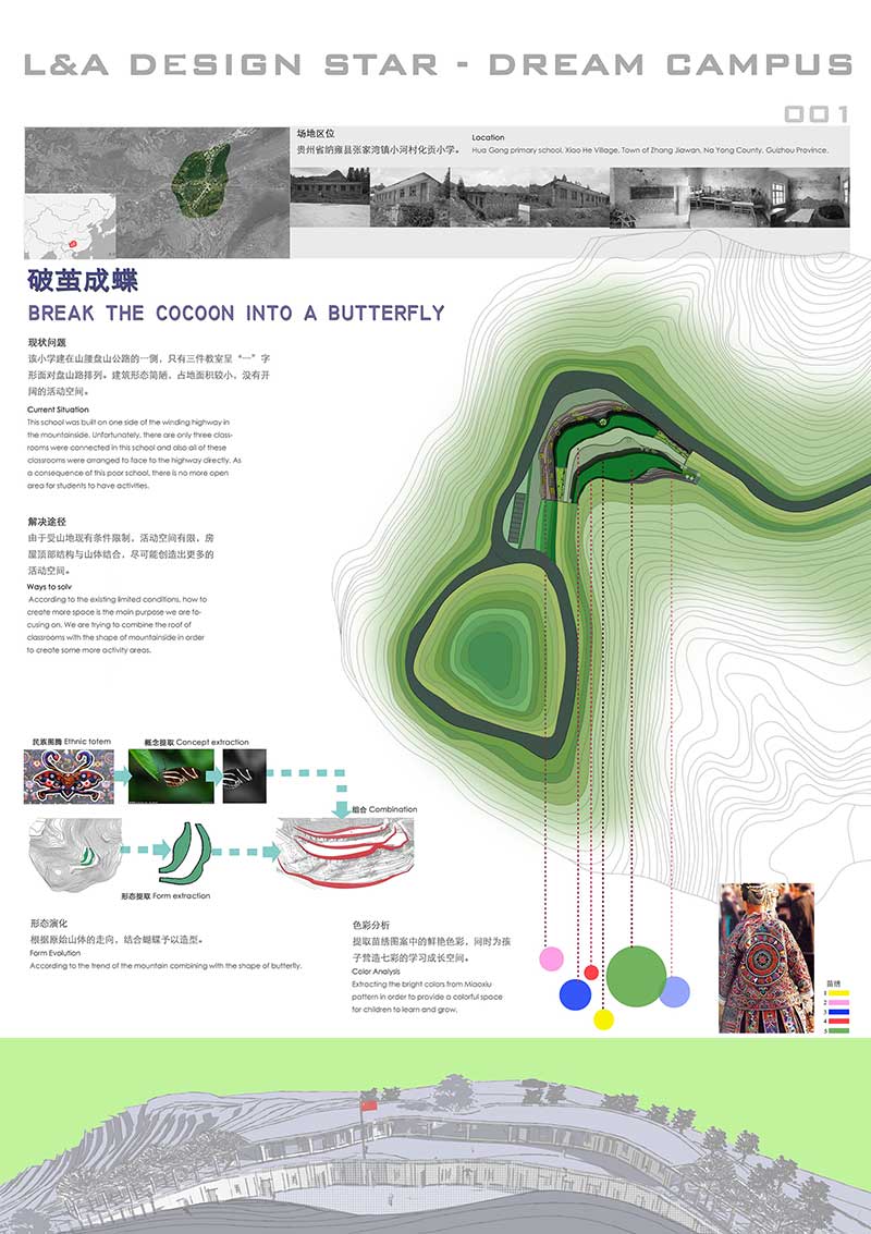 場地位于貴州省納雍縣,從貴州少數(shù)民族紋樣中提取“蝴蝶媽媽”的圖騰概念和苗繡中的鮮艷色彩,根據(jù)原始山體走向結合蝴蝶給予造型,為孩子營造七彩的學習空間。將當?shù)氐奶萏锞坝^與建筑形態(tài)相結合,整體構成就像蝴蝶伸開的羽翼,就地取材運用自然資源建設生態(tài)型建筑。