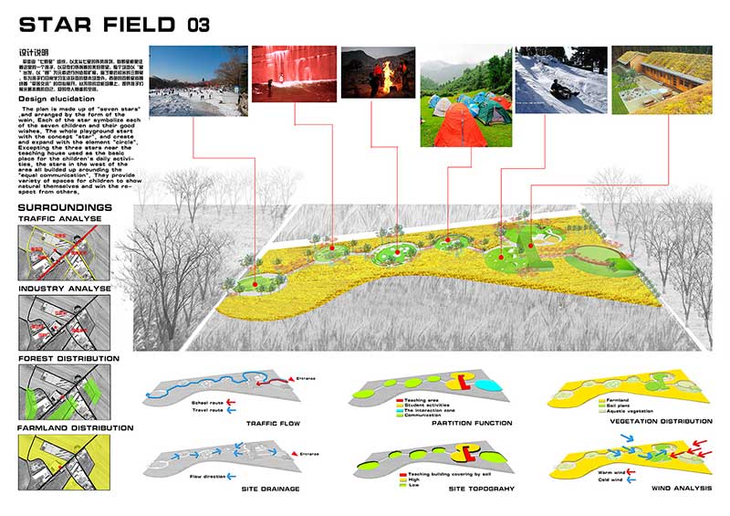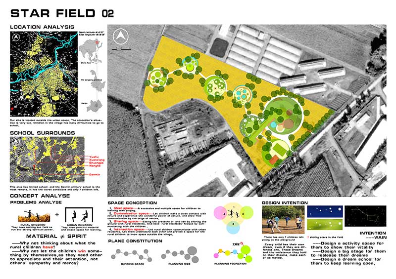 平面由七顆星組成,以北斗七星的陣勢(shì)排列,每顆星都象征著一個(gè)孩子的美好愿望。整個(gè)場(chǎng)地以“星”出發(fā),以“圓”為元素進(jìn)行創(chuàng)造和擴(kuò)展,靠近校舍的三顆星作為孩子們?nèi)粘W(xué)習(xí)生活的場(chǎng)地,西部四顆星圍繞著平等交流展開(kāi),提供孩子們展示最本真的自己,贏得他人尊重的空間。