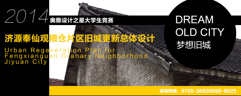 “奧雅設(shè)計(jì)之星大學(xué)生競(jìng)賽”是奧雅與中國(guó)及海外知名院校合作,一同致力于培養(yǎng)中國(guó)乃至世界設(shè)計(jì)大師的長(zhǎng)期計(jì)劃,它同時(shí)也旨在提供一個(gè)有價(jià)值的聯(lián)接學(xué)校教育和行業(yè)熱點(diǎn)的設(shè)計(jì)交流平臺(tái),推動(dòng)行業(yè)的發(fā)展。繼2011年“概念花園”、2012年“夢(mèng)想校園”、2013年“夢(mèng)想古鎮(zhèn)”之后,2014年奧雅設(shè)計(jì)之星大賽的選題定義為“夢(mèng)想舊城——濟(jì)源奉仙觀糧倉(cāng)片區(qū)舊城更新總體設(shè)計(jì)”,關(guān)注舊城更新與產(chǎn)業(yè)升級(jí)規(guī)劃,探討我國(guó)舊城發(fā)展新模式和思路,幫助我國(guó)大量“舊城”實(shí)現(xiàn)可持續(xù)健康發(fā)展。