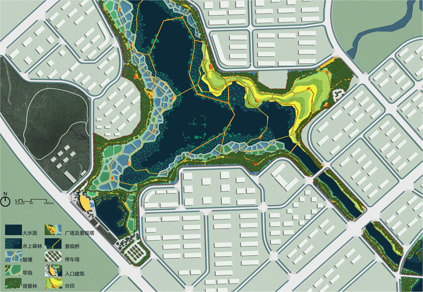 一部分水通過(guò)兩除磷池凈化處理,一部分水送至北部泉眼,形成水景和溪流疊水,一部分送入三個(gè)湖灣,水自北向南再次匯流入駁岸過(guò)濾系統(tǒng),保證了水系流動(dòng)性,并完成循環(huán)。