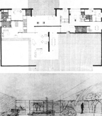 1930年代——庭院式住宅:有限的內(nèi)外不僅僅密斯在1920年代眾多表現(xiàn)畫上洋溢的激情不再,他設(shè)計的建筑方案本身也趨向于內(nèi)向和封閉。從1930年代開始密斯不停地探索庭院式住宅的各種可能。這些住宅通常外部用磚墻封閉起來,內(nèi)部則在矩形的地塊上作出建筑與院落關(guān)系的劃分,并利用玻璃隔墻在室內(nèi)與室外的庭院形成了通透的效果,建筑室內(nèi)的布置沿承了巴塞羅那館中的自由平面布局特點。 |