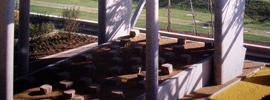 傳統(tǒng)園林要素的變形和再現(xiàn) 在面包圈花園、奈可園、懷特海德研究所的“分裂園”、鹽湖城新監(jiān)獄庭院、Jacob Javits廣場(chǎng)等設(shè)計(jì)中都有法國(guó)17世紀(jì)花園的抽象和變形。尤其在“分裂園”的設(shè)計(jì)中,超現(xiàn)實(shí)主義和對(duì)自然的抽象化給人以強(qiáng)烈的視覺(jué)印象!胺至褕@”是一個(gè)25x35英寸的屋頂花園,也是這個(gè)微生物研究中心搜集 |
