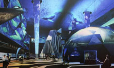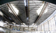 西展廳南北跨180米,東西跨126米,為矩形超大跨度無柱空間,相當于3個標準足球場大小。2.5萬平方米、14米凈高的無柱空間,既符合了世博會的布展要求,也有利于世博會后舉辦各類展覽和活動。