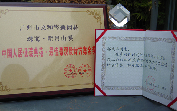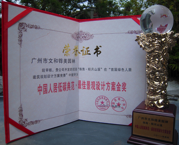 3)珠海明月山溪項目獲得了“中國人居低碳典范·最佳景觀設計方案金獎”;